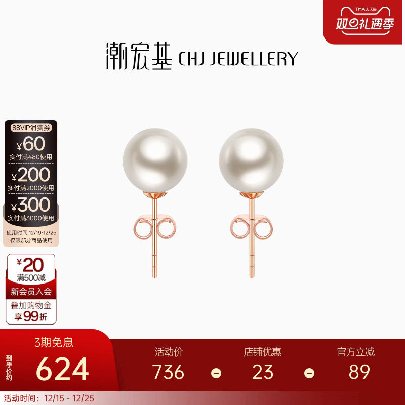 潮宏基至简红18K淡水珍珠耳钉气质玫瑰彩金耳环耳饰生日生日