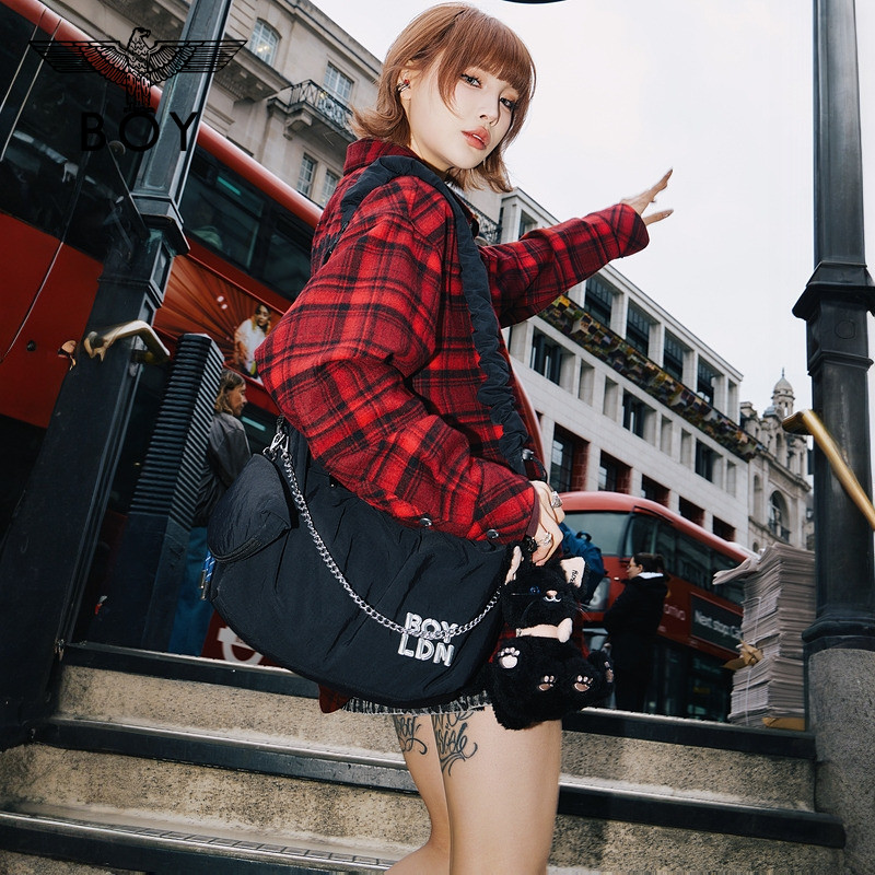 BOYLONDON潮流红格纹绣花翻领上衣长袖春季男女同款衬衫N21037
