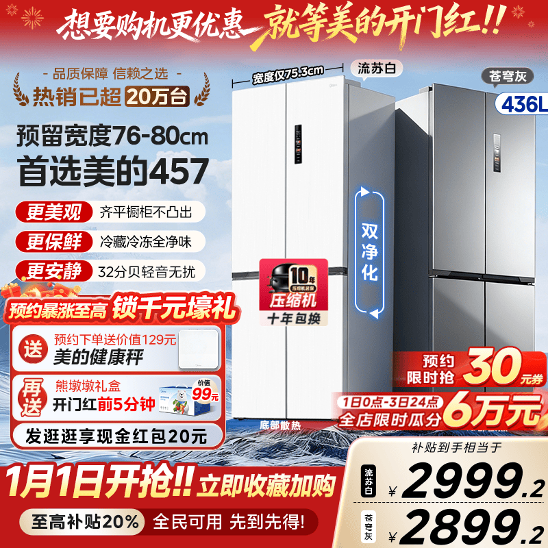 美的457超薄零嵌入式十字双开四门电冰箱家用小户型风冷无霜一级
