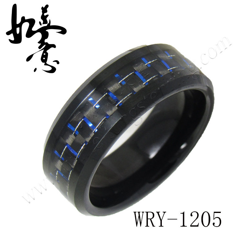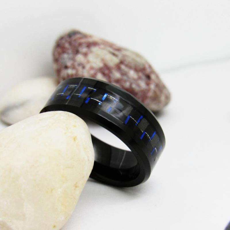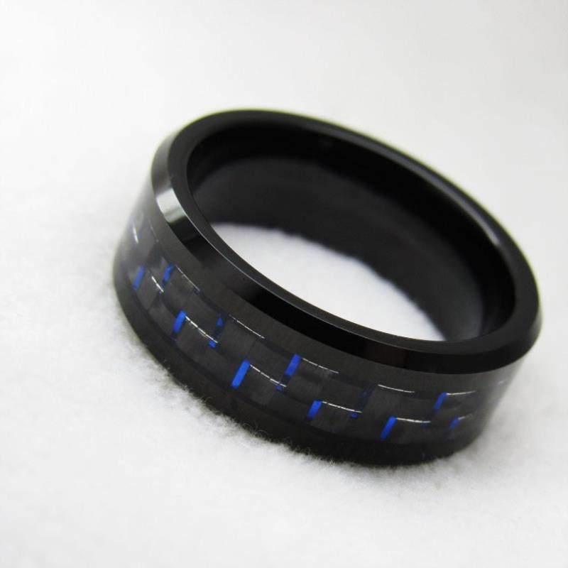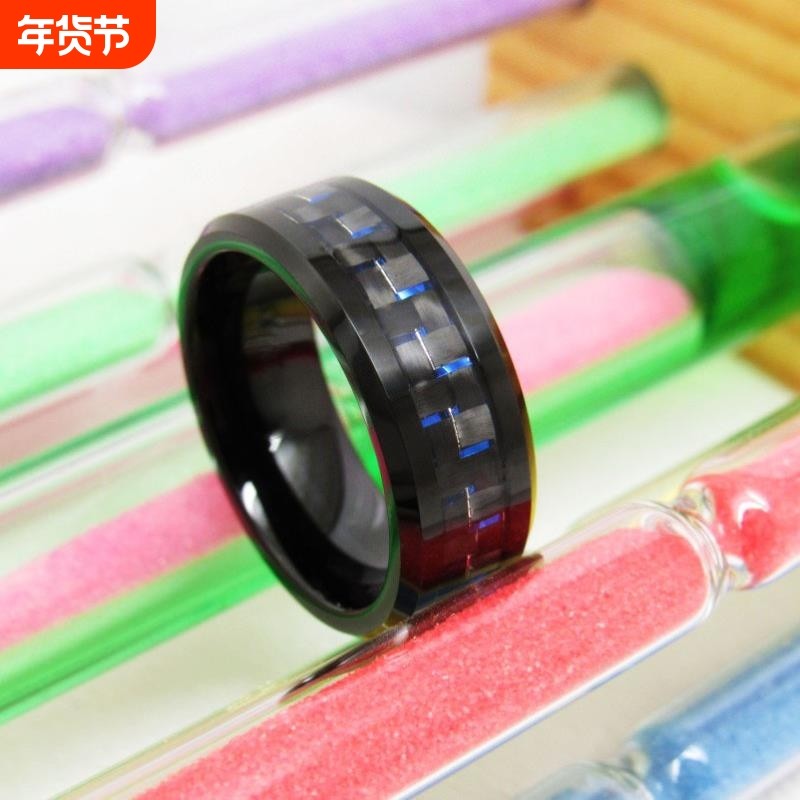 万如意钨金戒指 八宽批边电黑镶蓝黑碳纤外贸时尚欧美饰品现货