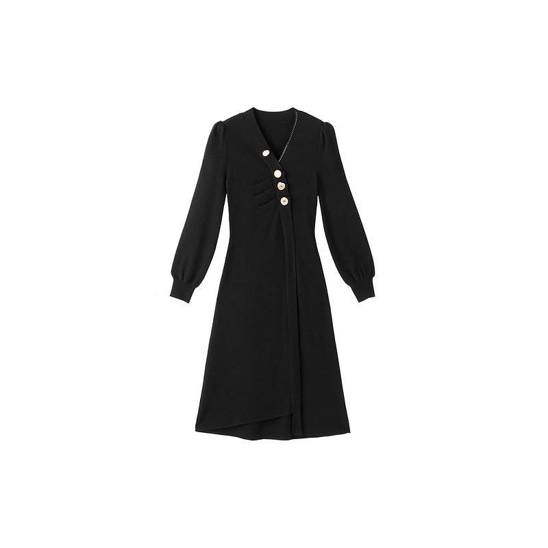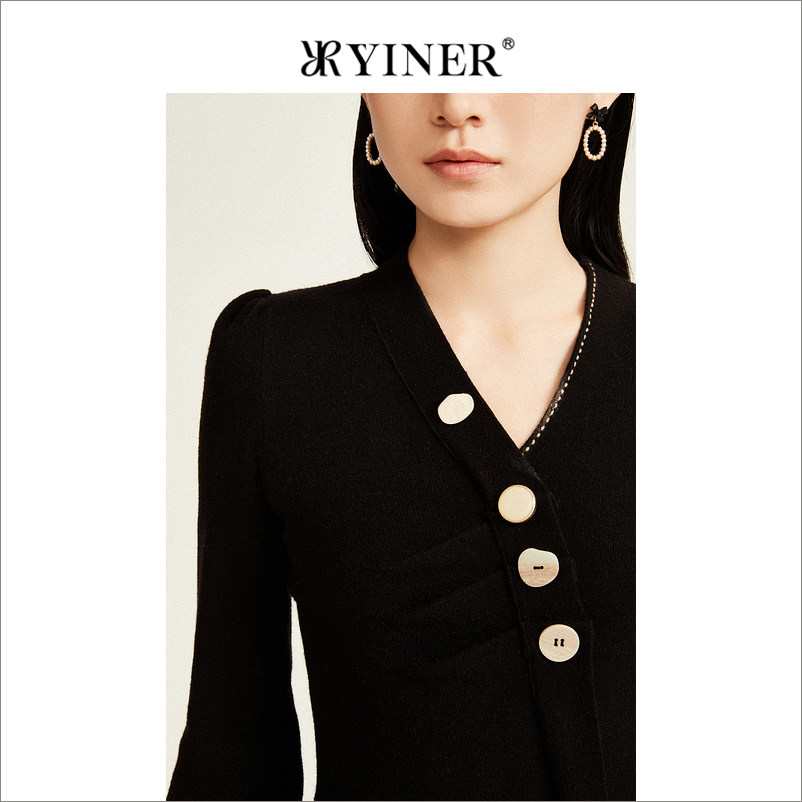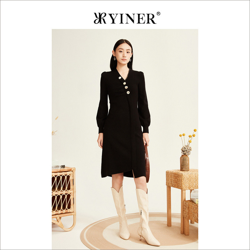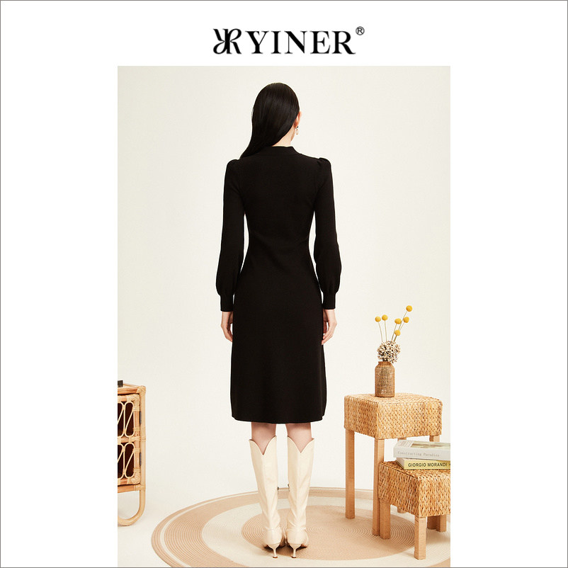 YINER音儿专选女装冬季V领收褶公主袖针织小黑裙连衣裙