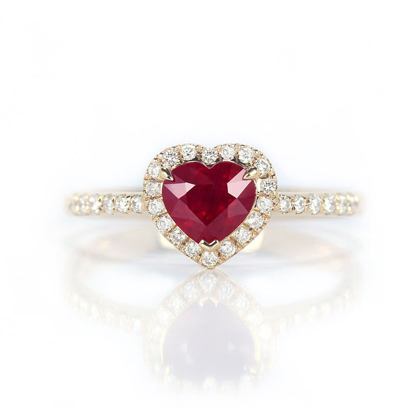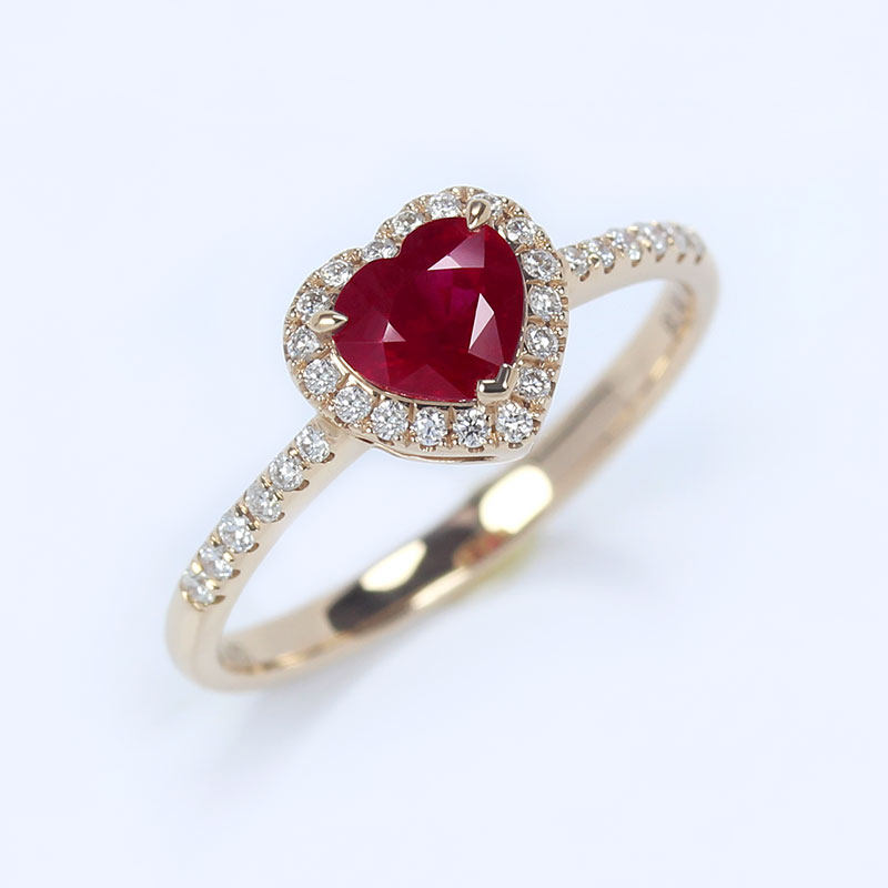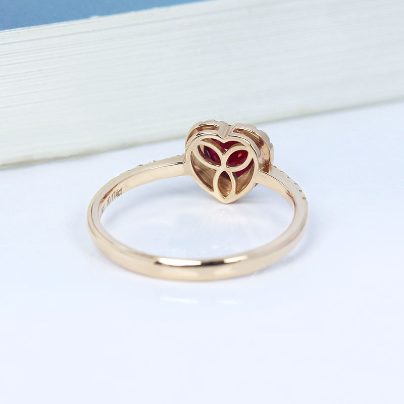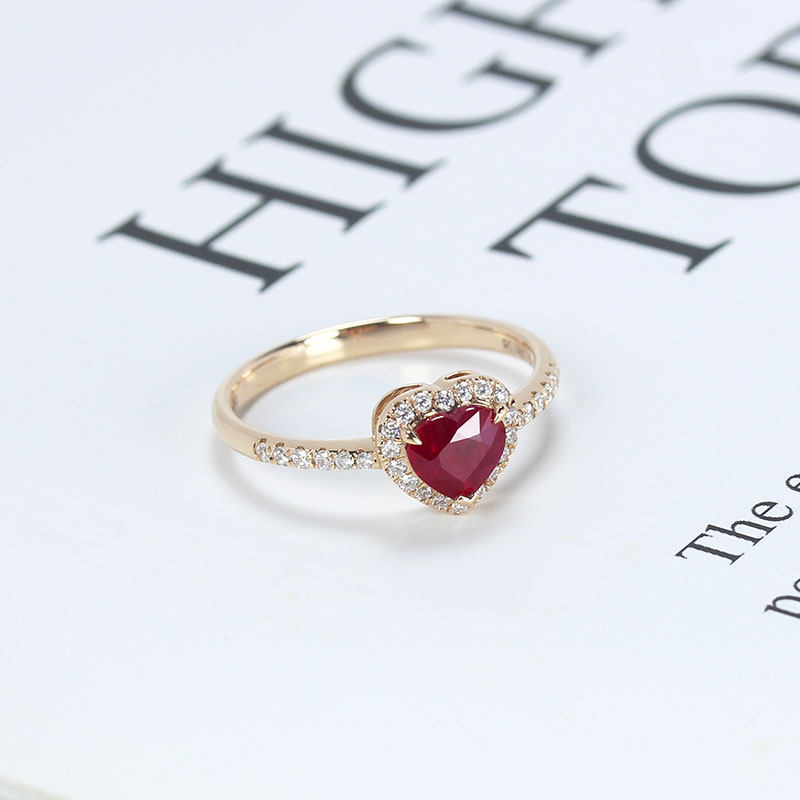 18K玫瑰金缅甸天然鸽血红宝石爱心形戒指 正红色满镶钻石手饰女款