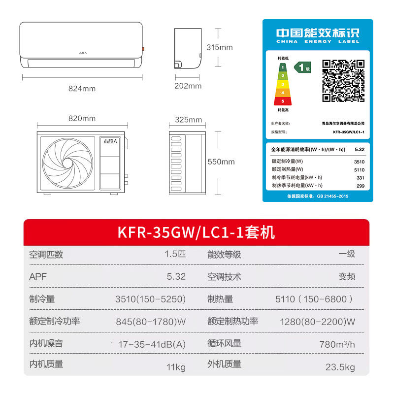 【政府补贴】海尔空调1.5P小超人新一级能效空调超省电家用挂机