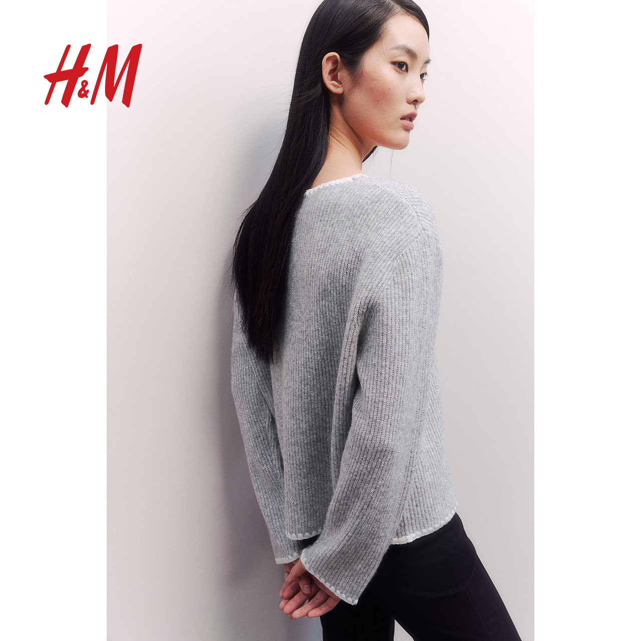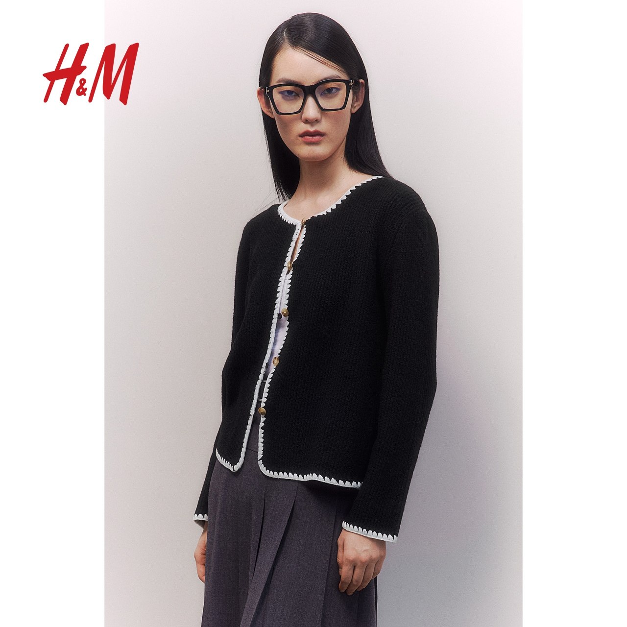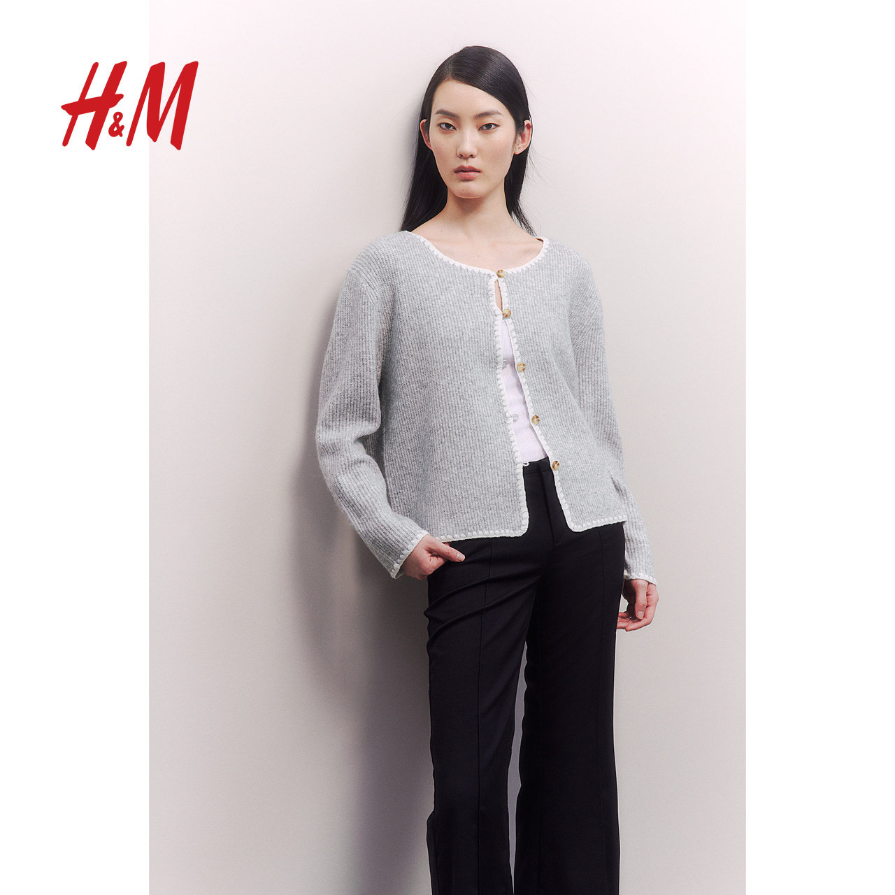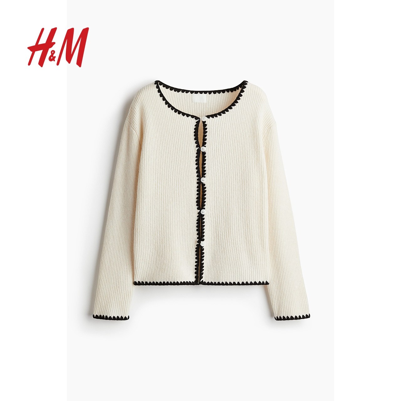 HM女装毛针织衫春季休闲外穿小香风针织开衫外套1275133