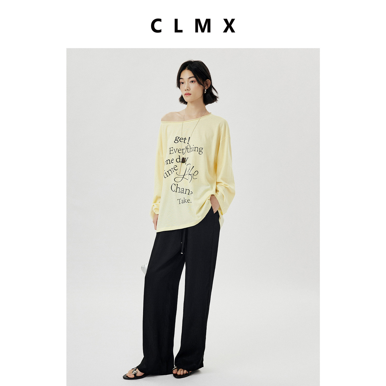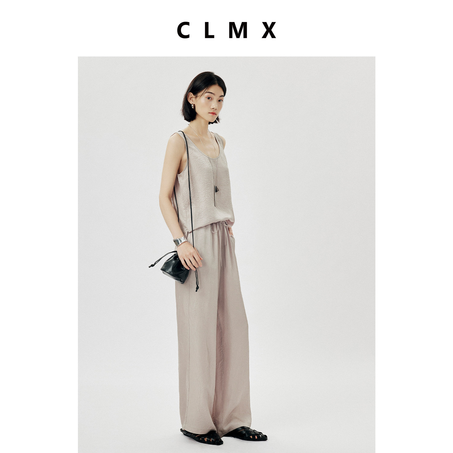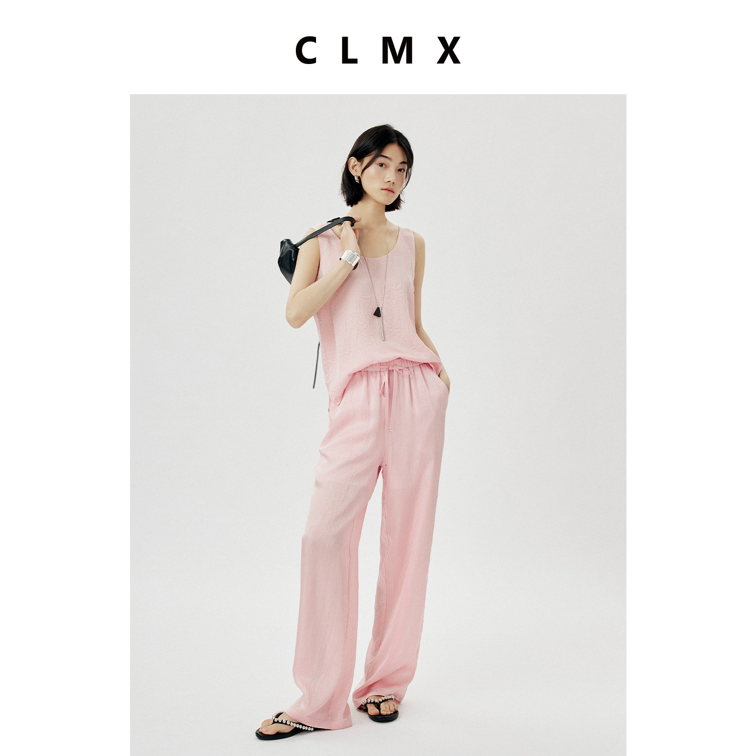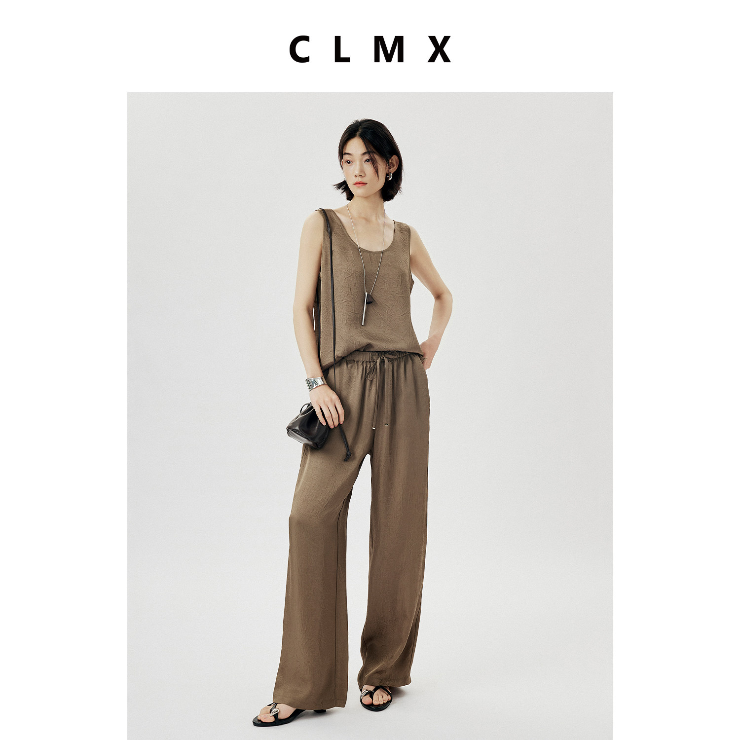 CLMX简约通勤休闲抽绳纯色裤子皱感肌理缎面醋酸面料系带直筒裤女