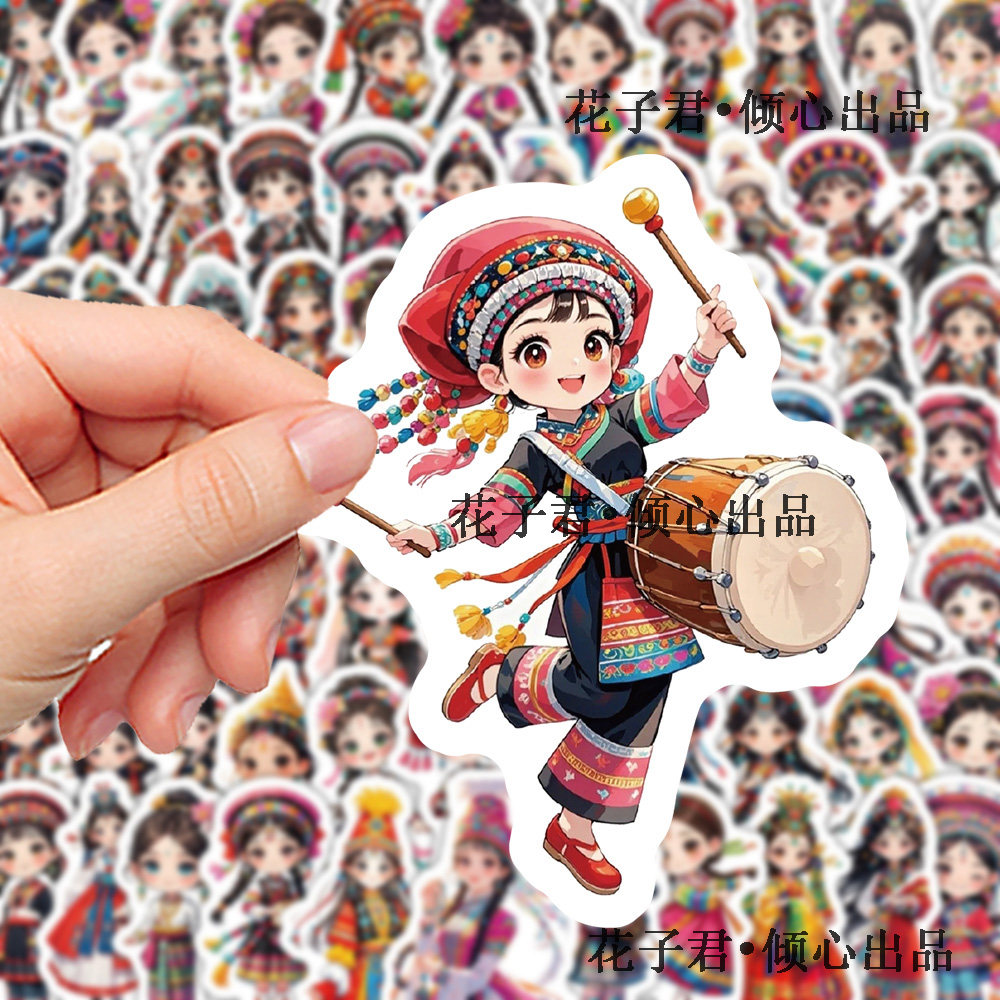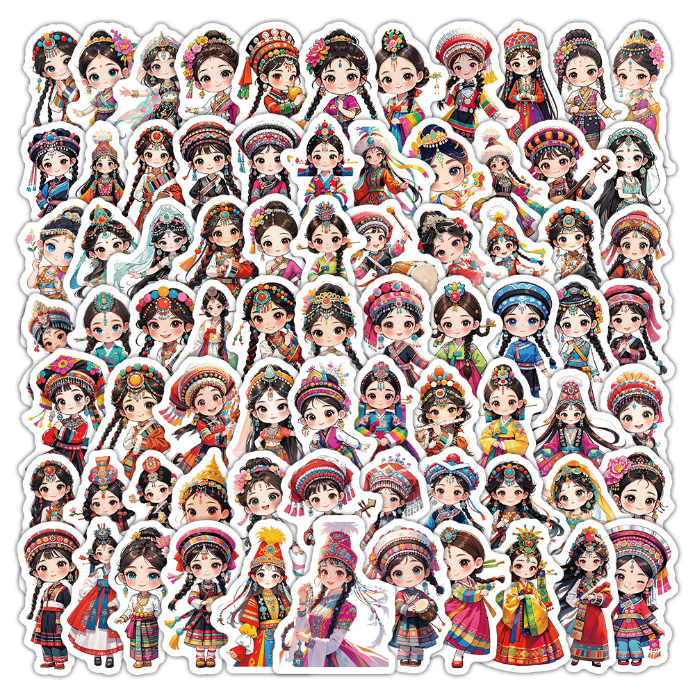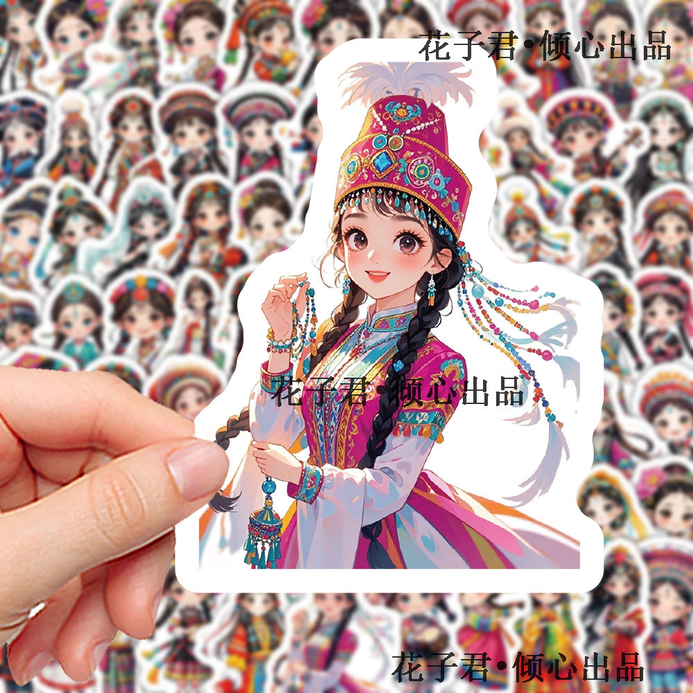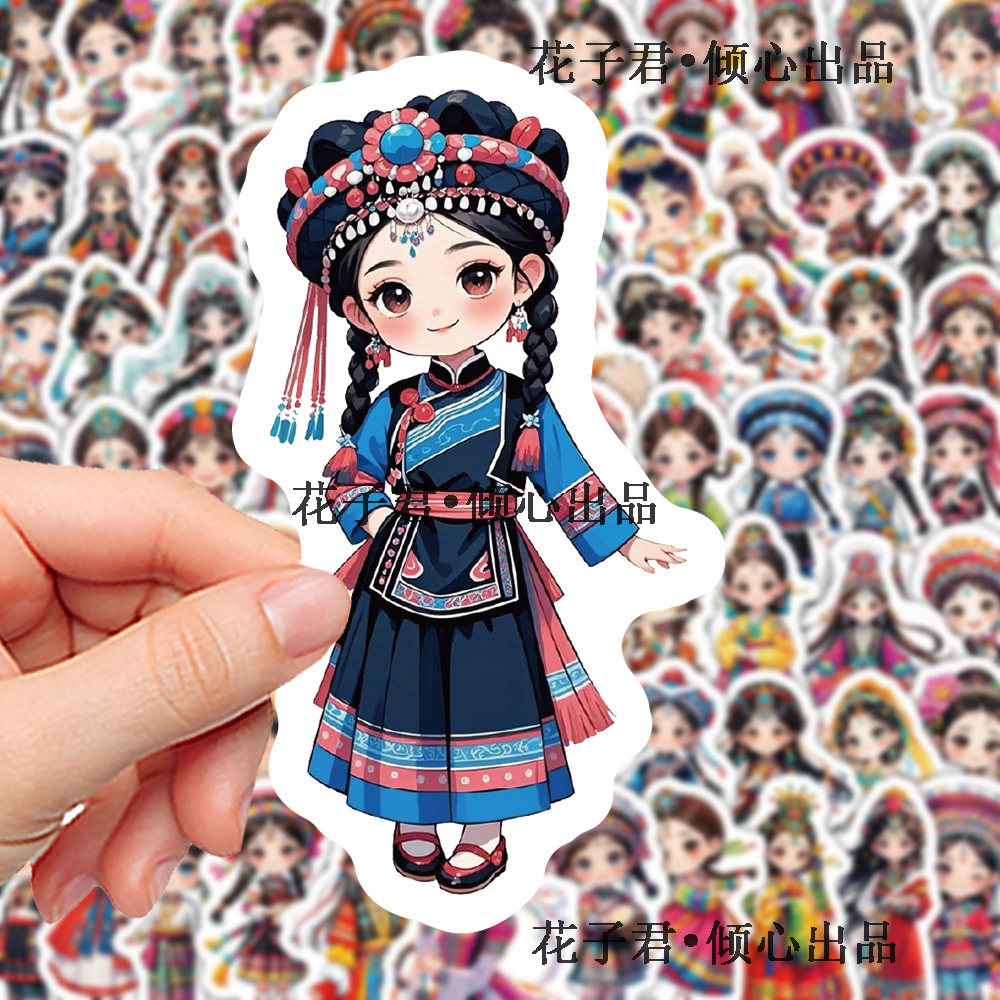 180张卡通民族女孩服饰贴纸Q版国风传统服饰插画手账素材贴画防水