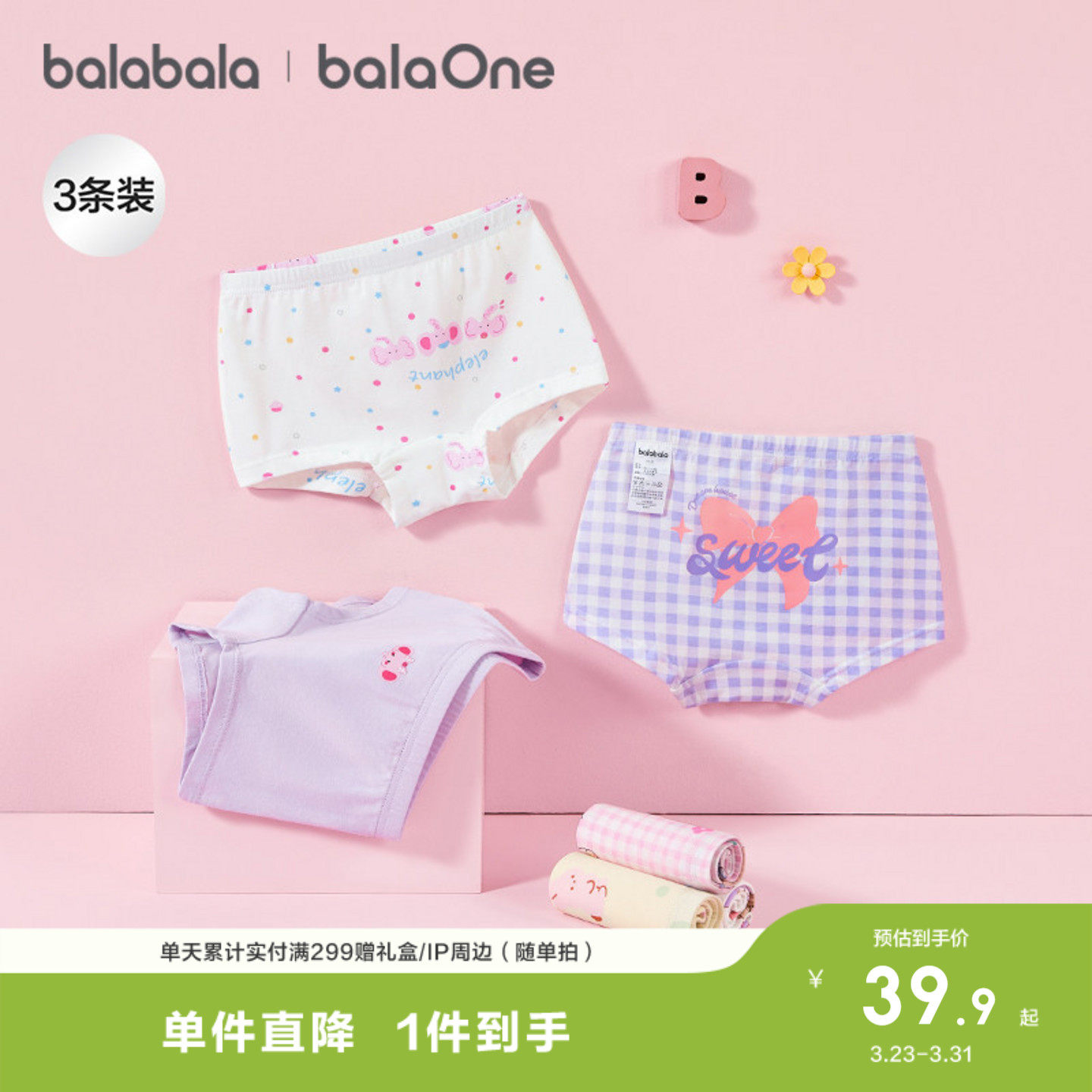 巴拉巴拉宝宝内裤平角纯棉儿童四角短裤小童男童女童短裤子三条装