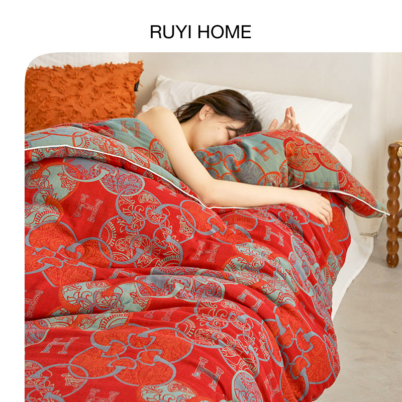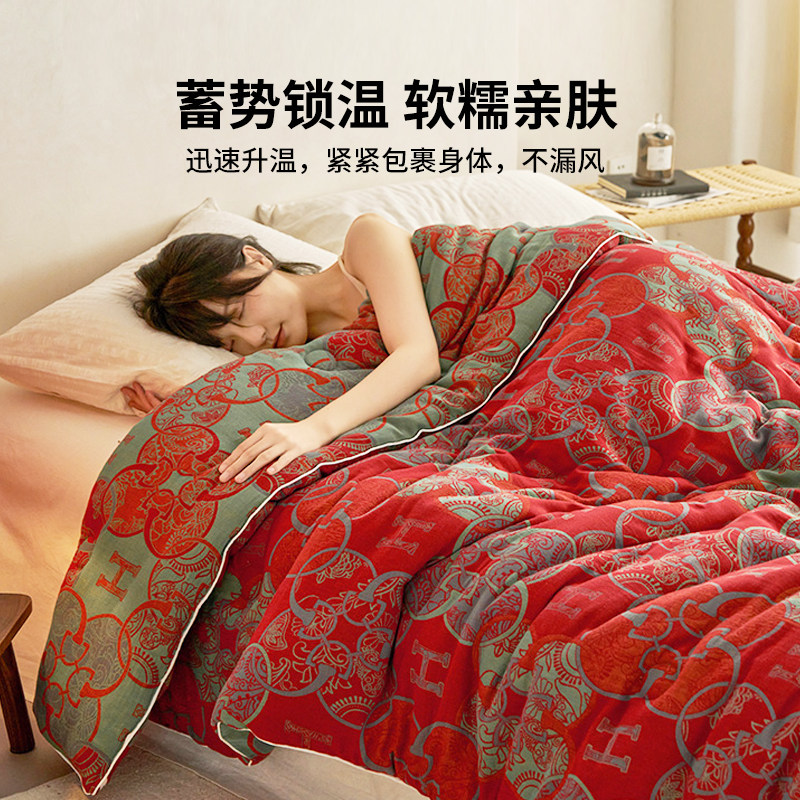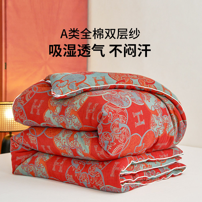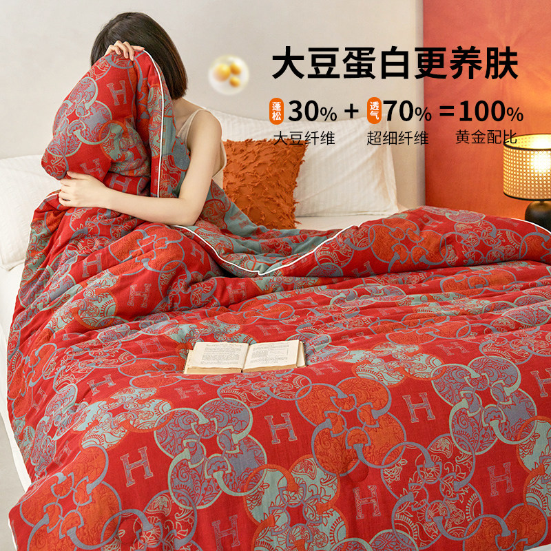 如奕A类双层纱大豆被子春秋被加厚保暖空调被芯冬被结婚红色喜被