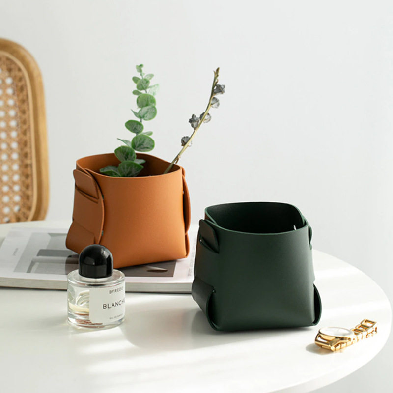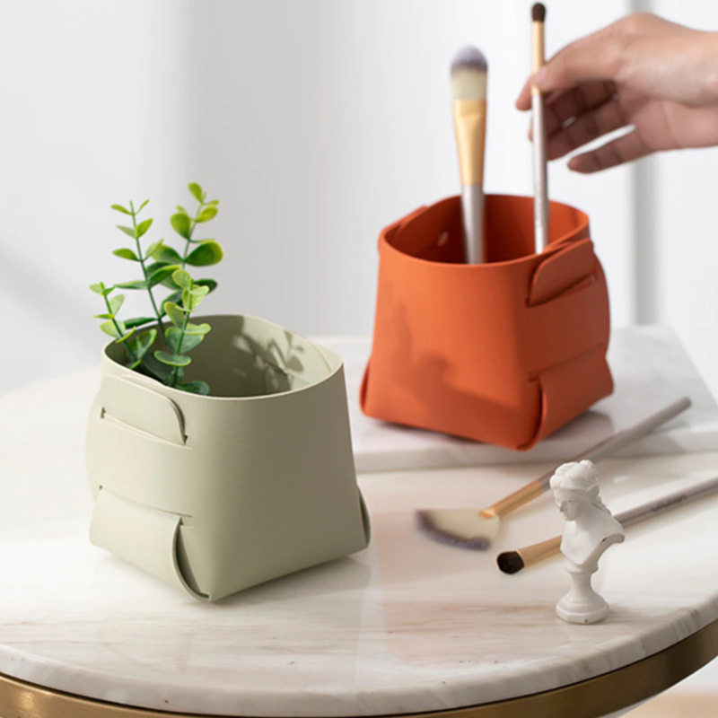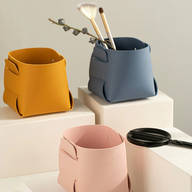 简约北欧桌面收纳盒眉笔化妆刷收纳桶 INS皮革折叠笔筒创意花器PU