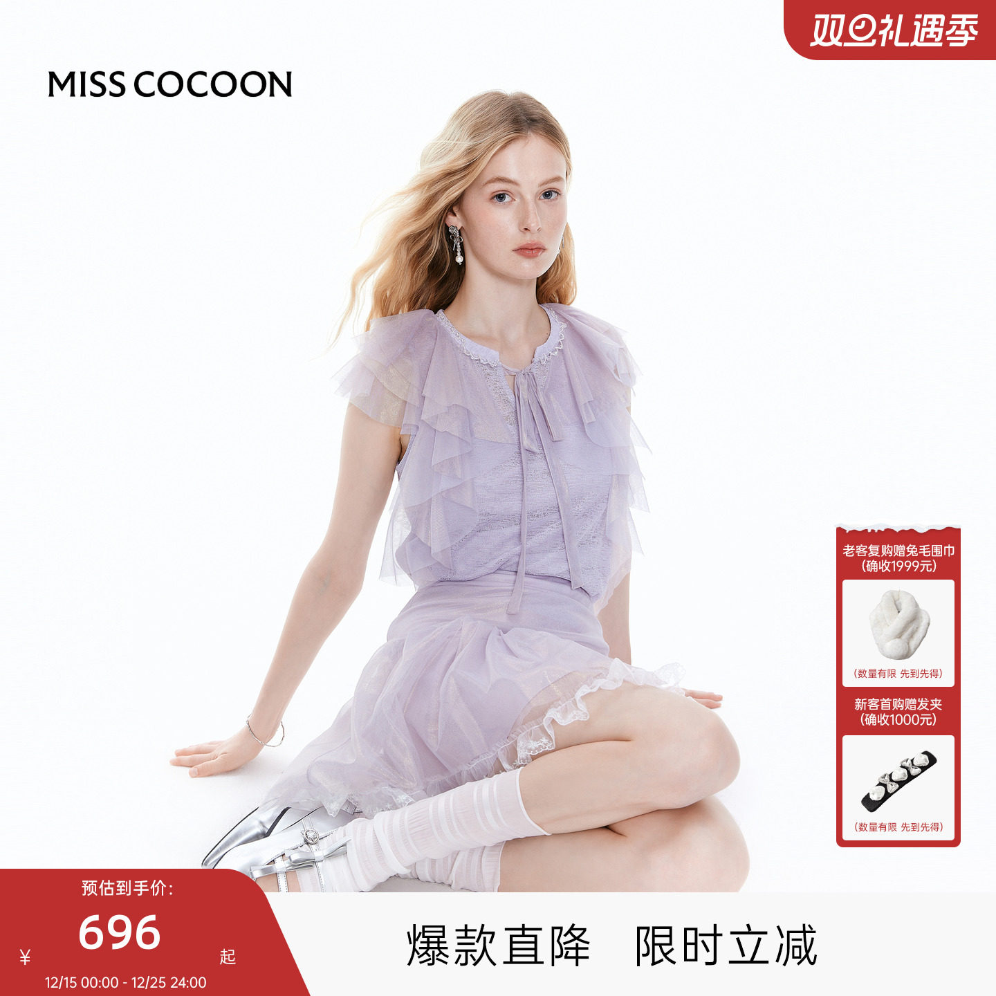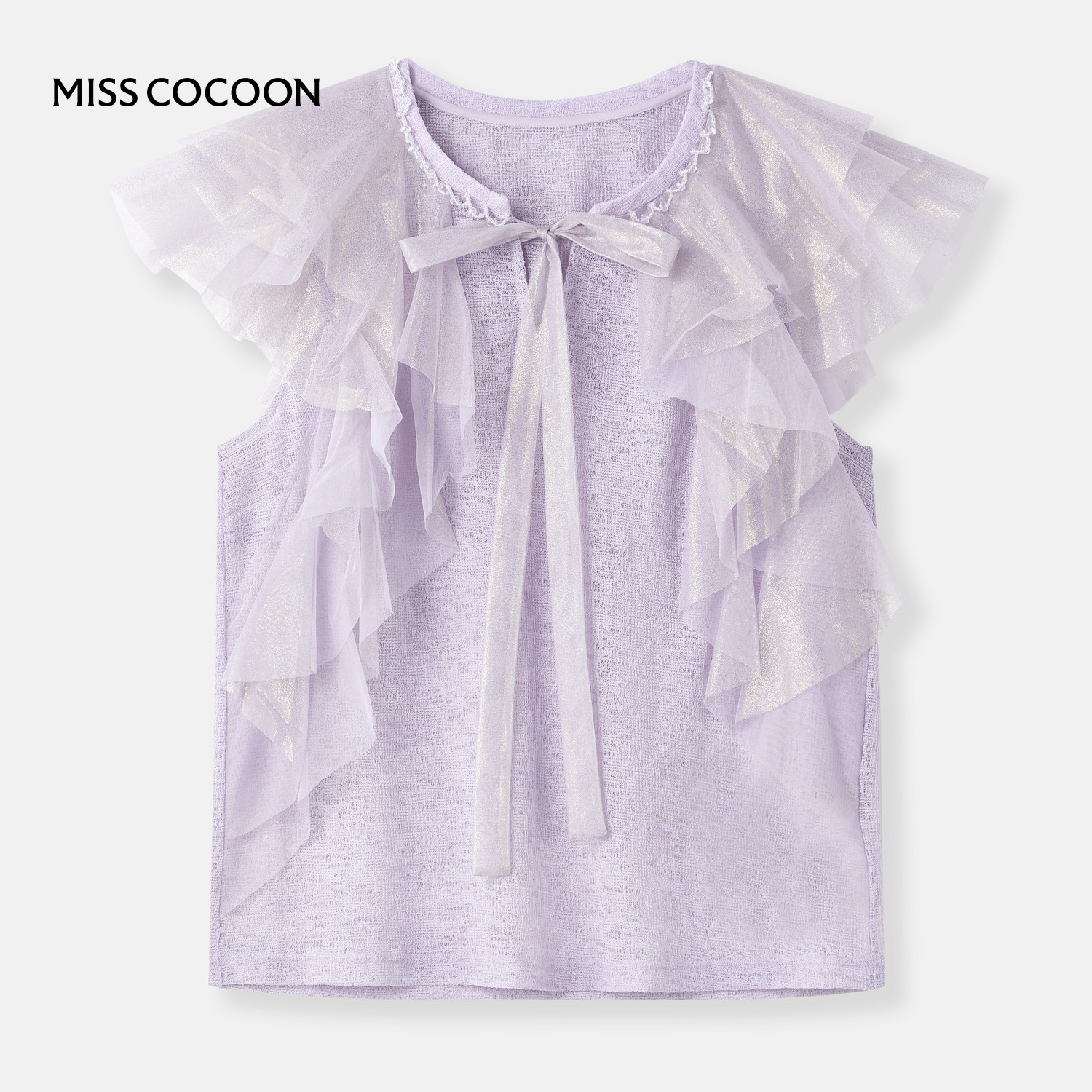 MISS COCOON可可尼小飞袖紫色短袖2025秋季新款荷叶边细闪针织T恤