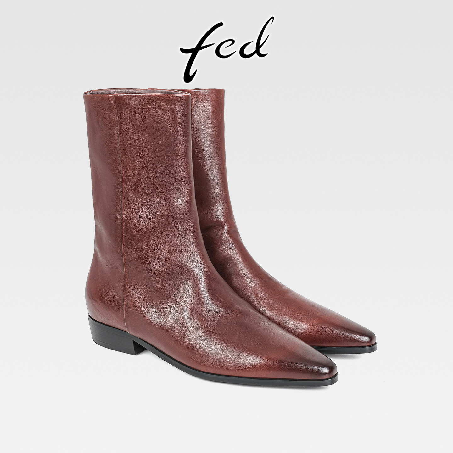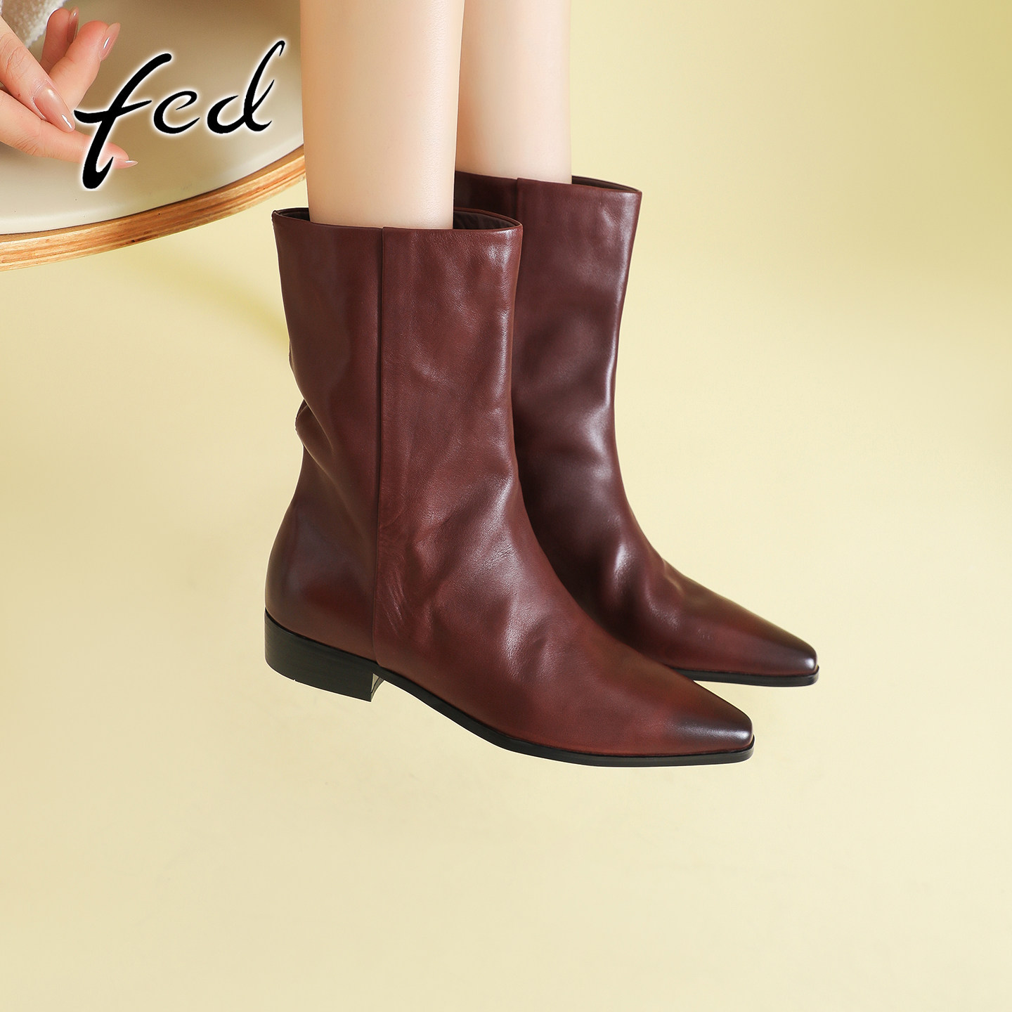 fed英伦风复古真皮粗跟宽筒骑士靴女秋冬新款低跟尖头中筒西部靴