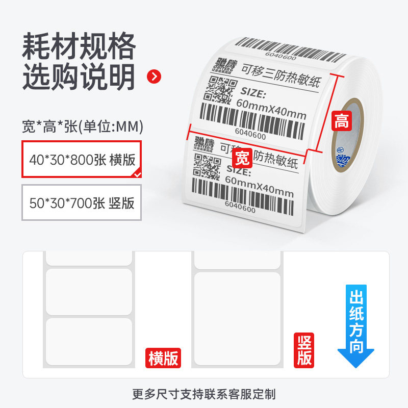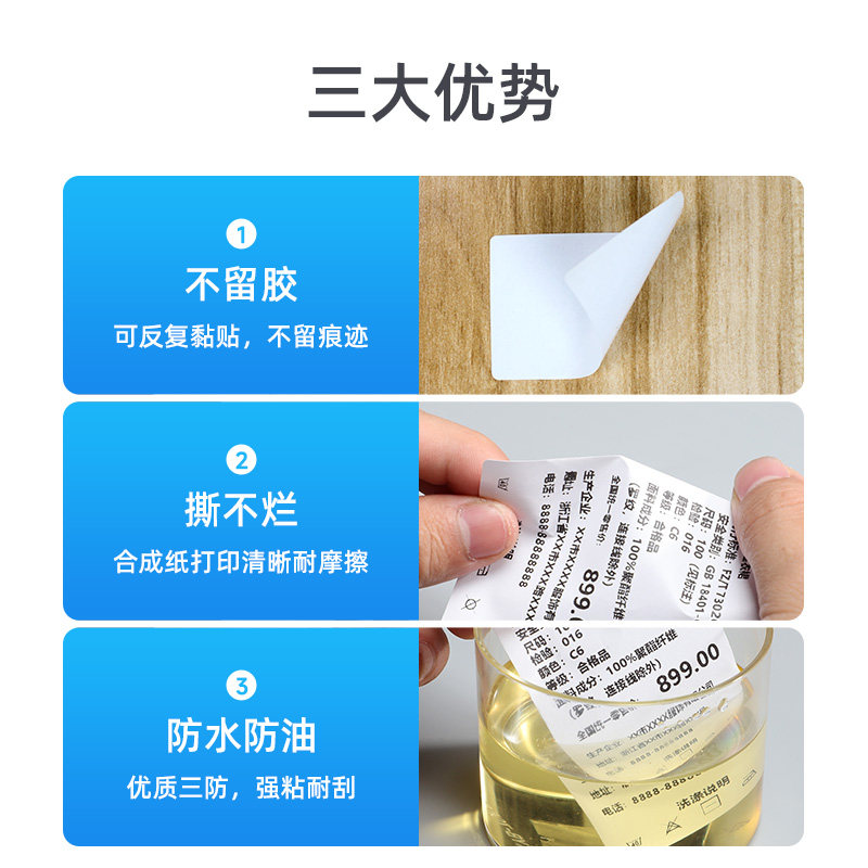 驰腾40mm可移除不干胶标签打印纸防水易撕不留胶钢化玻璃板材家具打印三防热敏合成纸条码纸