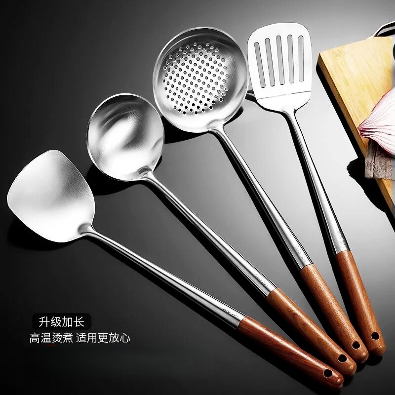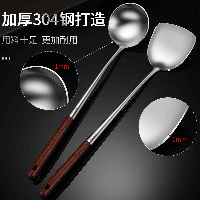 加长304不锈钢锅铲炒菜铁铲子厨房家用木柄炒铲炒勺汤勺漏勺套装