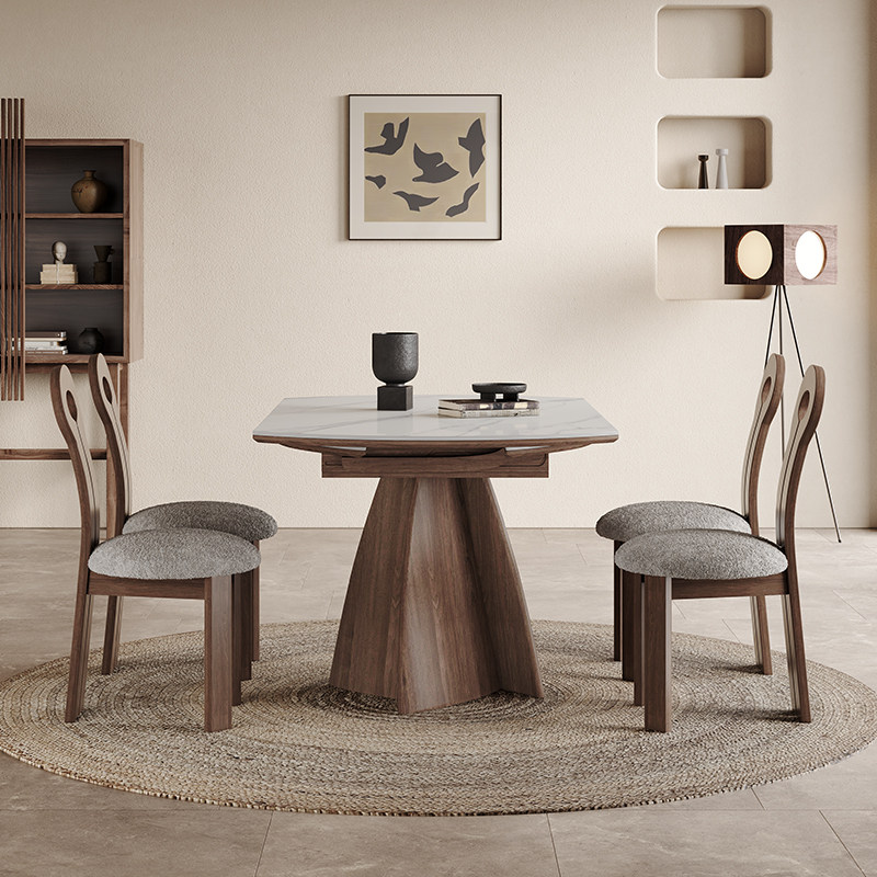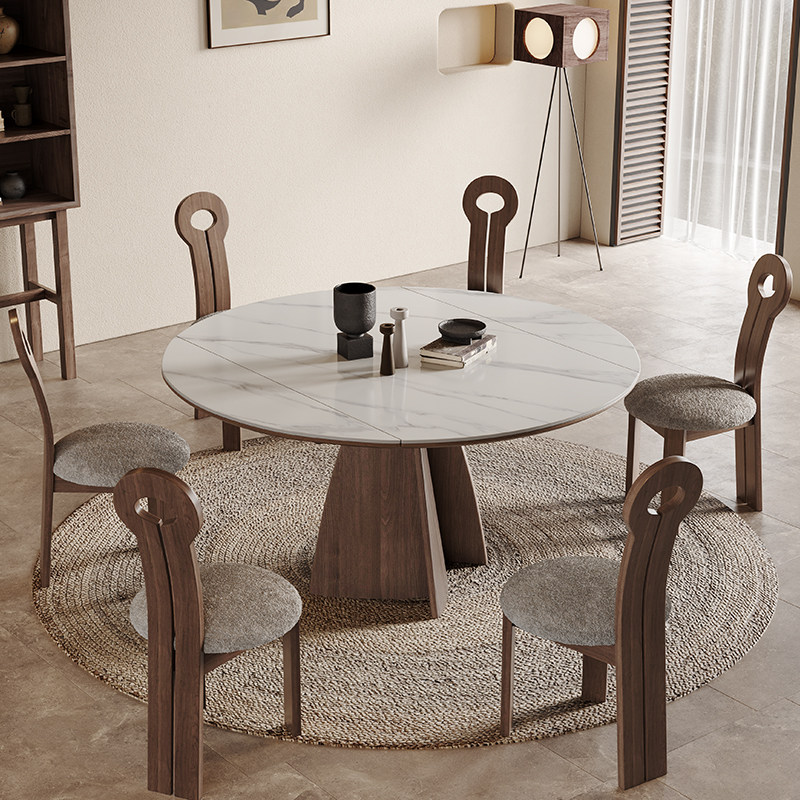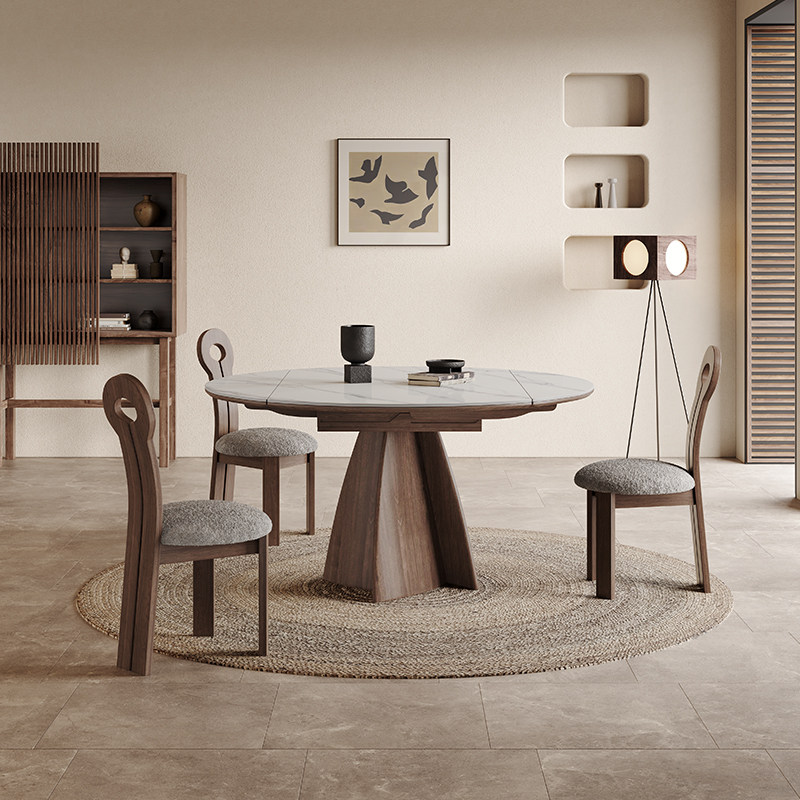 侘寂风实木伸缩餐桌圆形家用可折叠拉伸旋转意式北欧哑光岩板圆桌