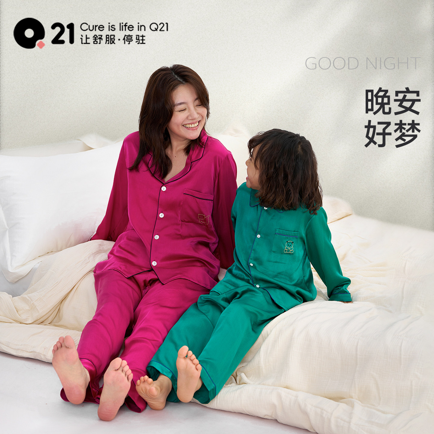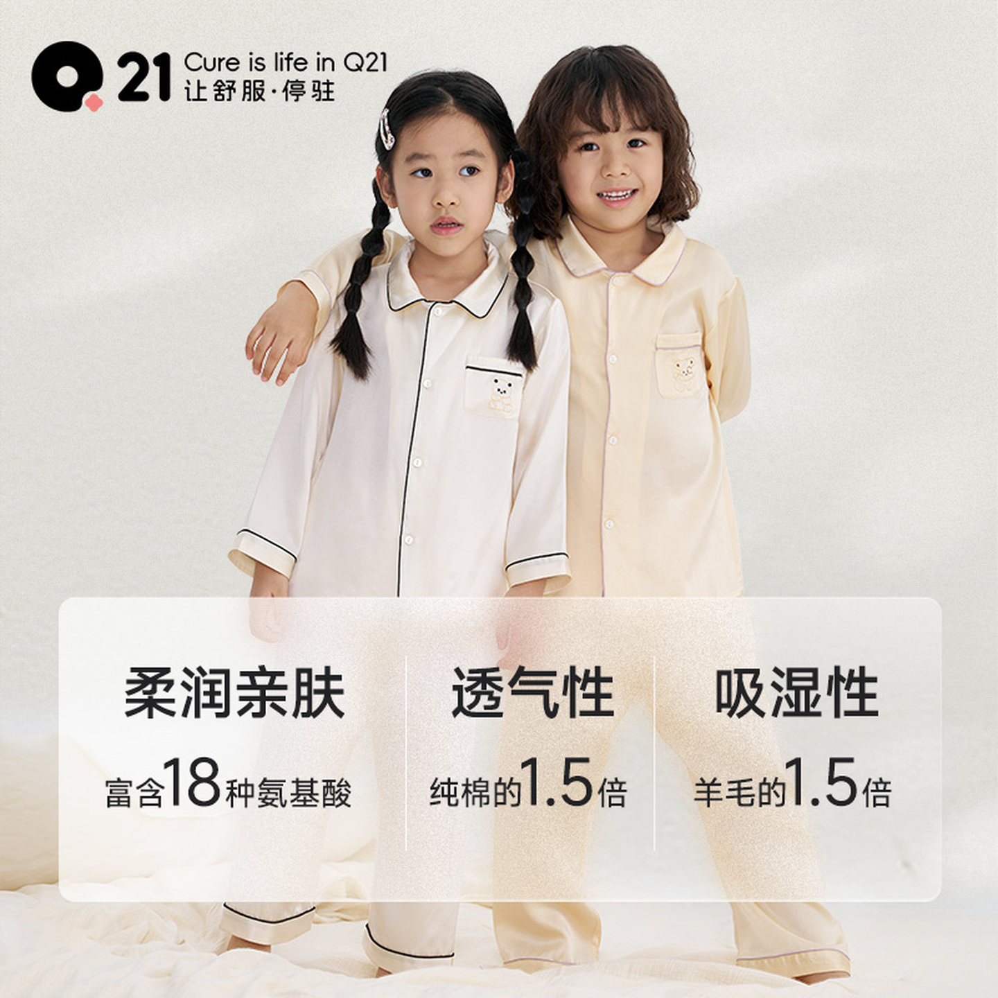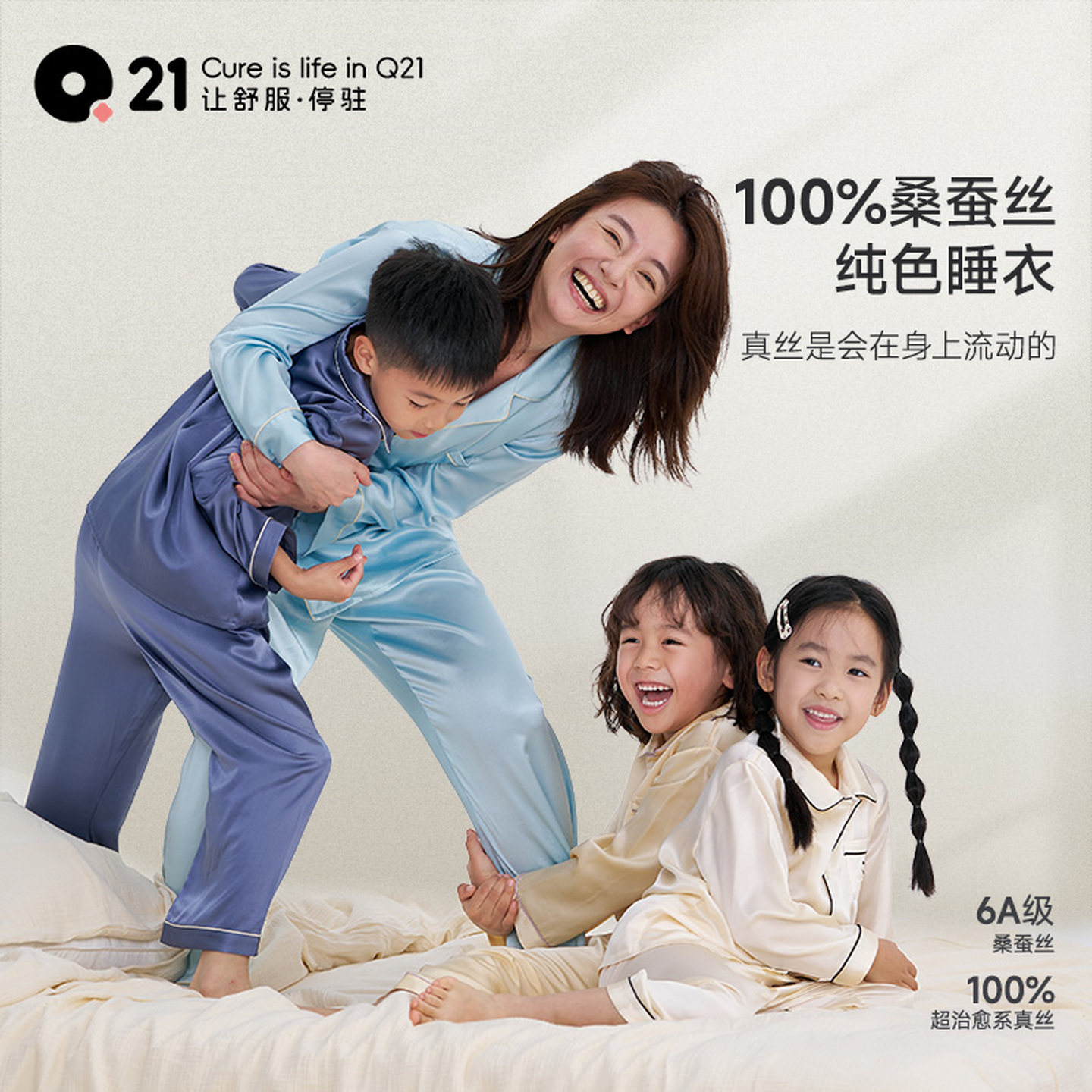 Q21儿童真丝睡衣男女童纯色6A级桑蚕丝家居服21姆米亲子套装春季