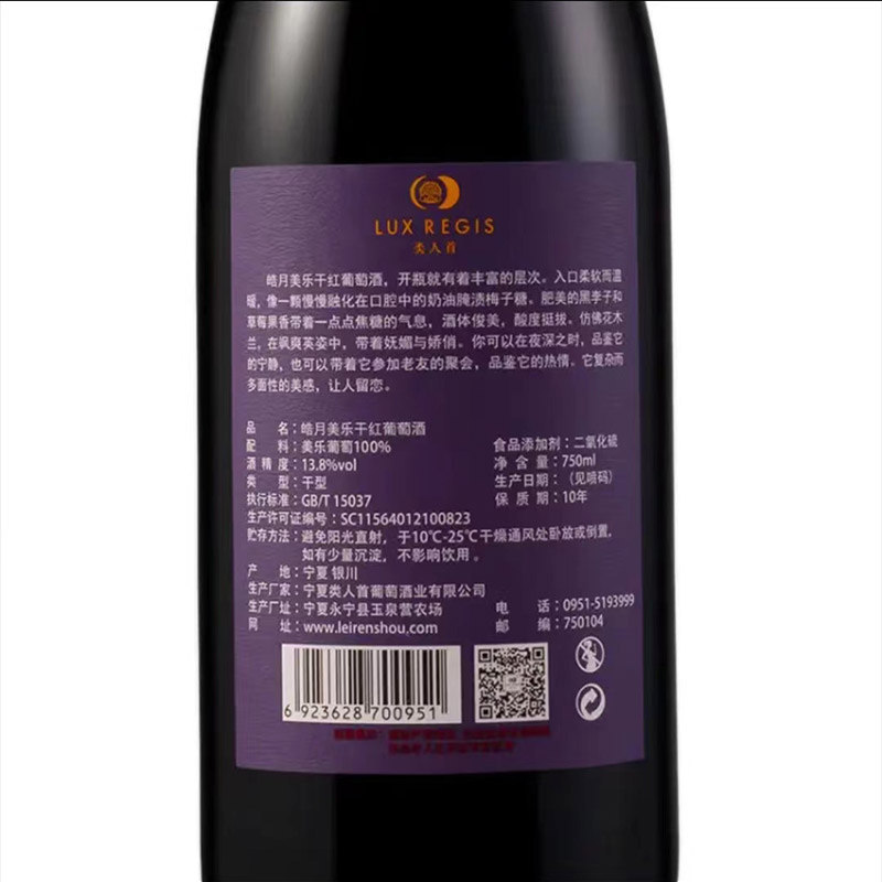 类人首宁夏红酒皓月美乐13.8度橡木桶干红葡萄酒750ml*6支装酒庄