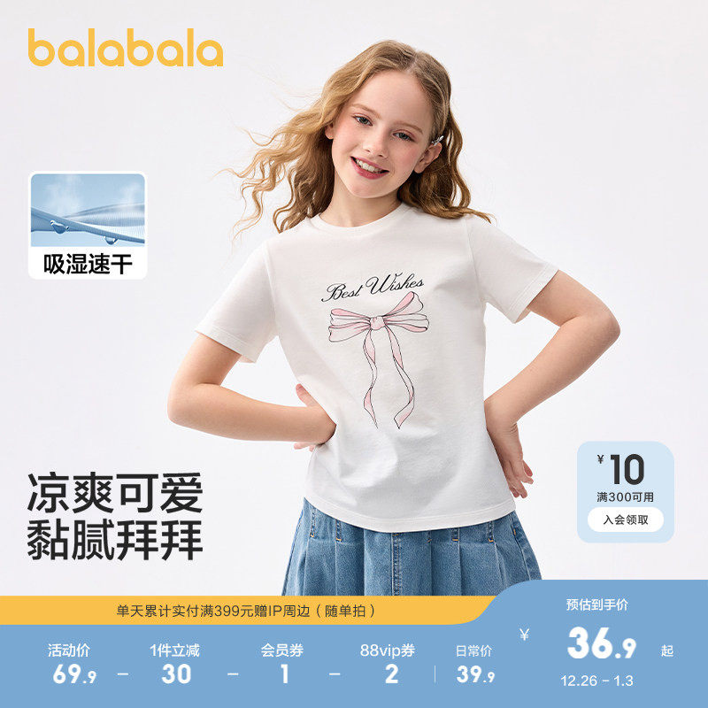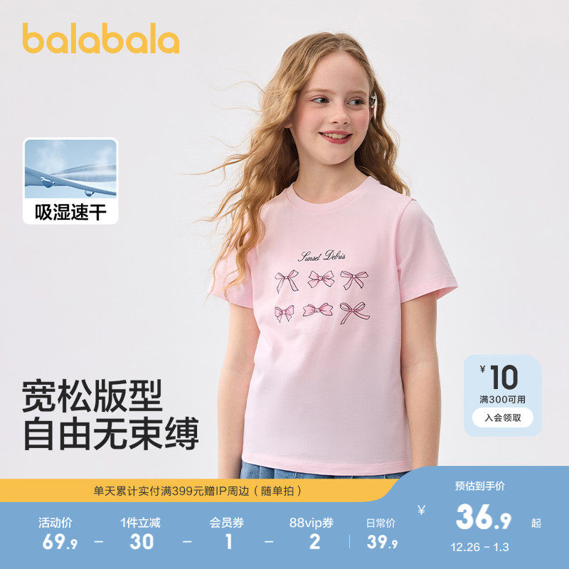 巴拉巴拉童装儿童短袖t恤女童2025新款夏装大童速干甜美纯棉上衣