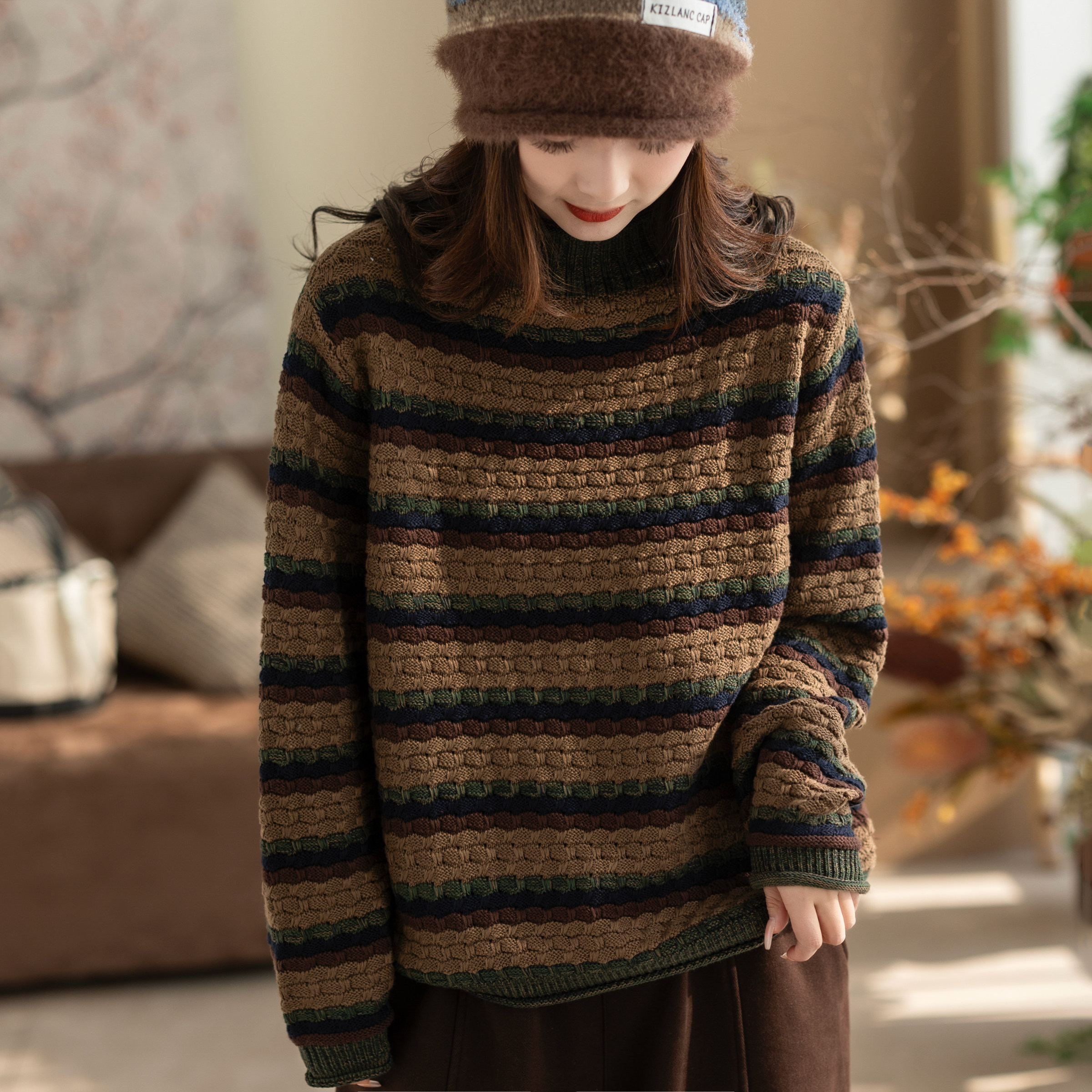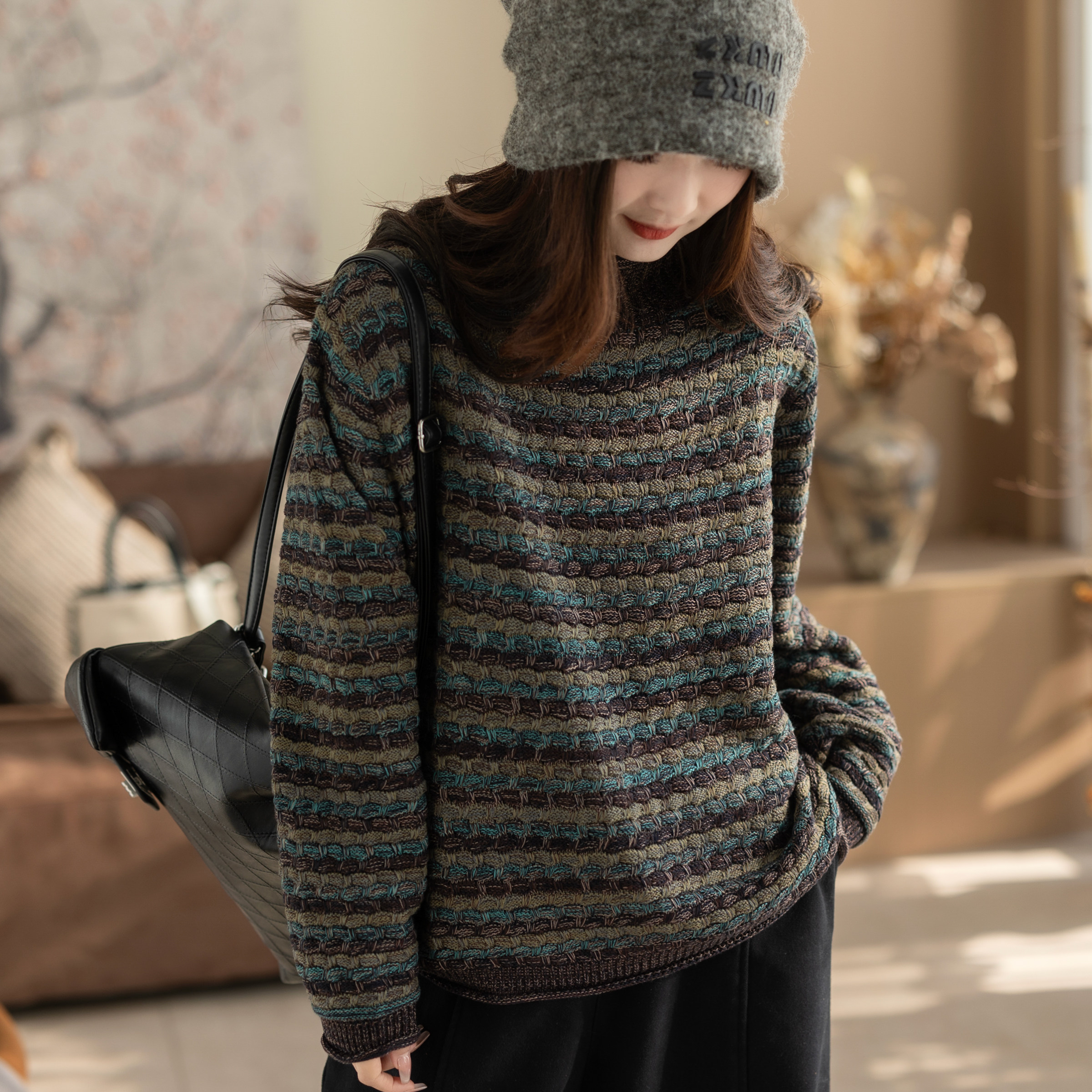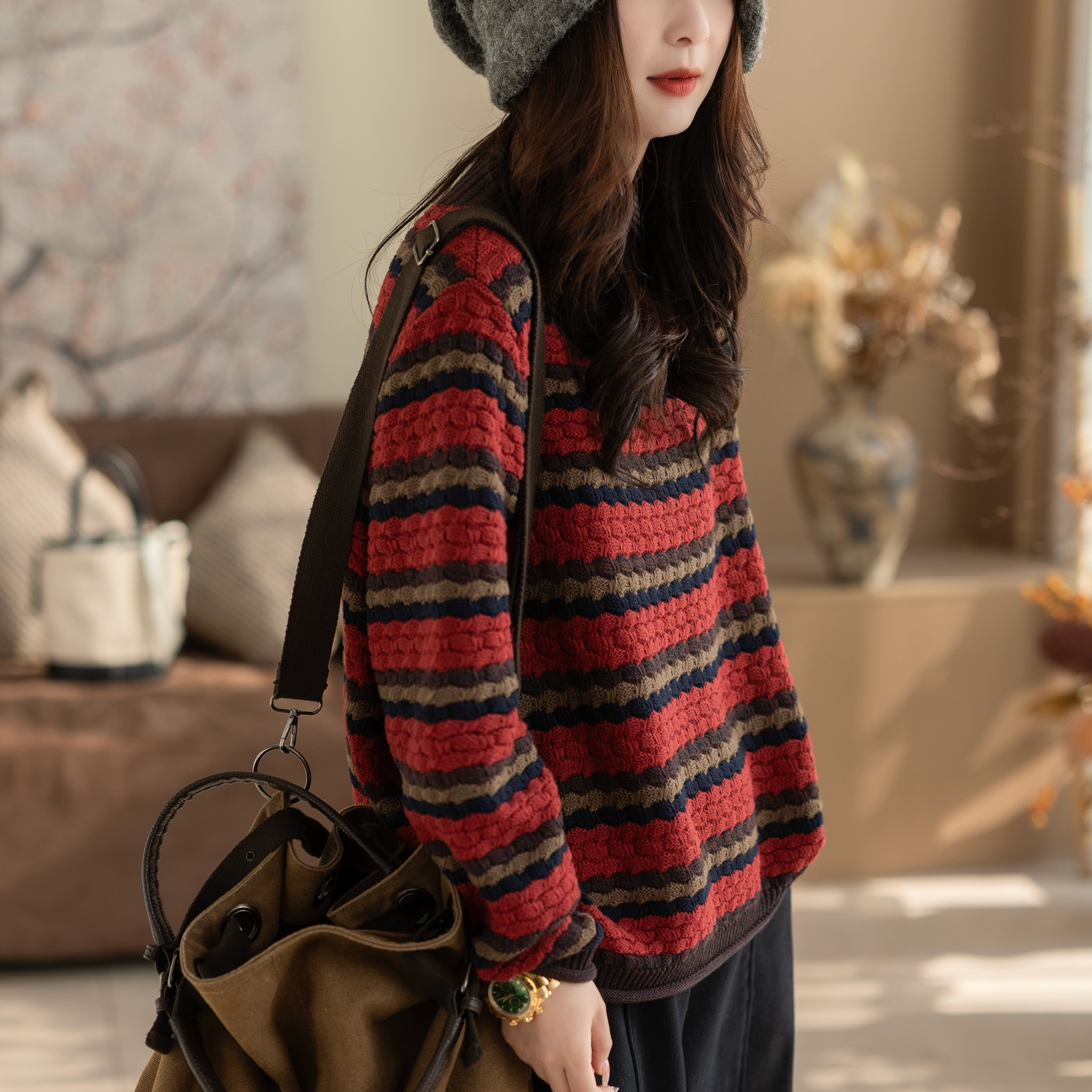 咖咪羽毛衣女秋冬时尚条纹针织复古文艺百搭宽松圆领套头长袖上衣