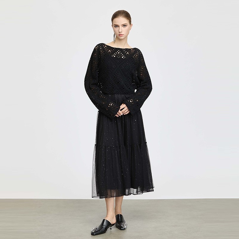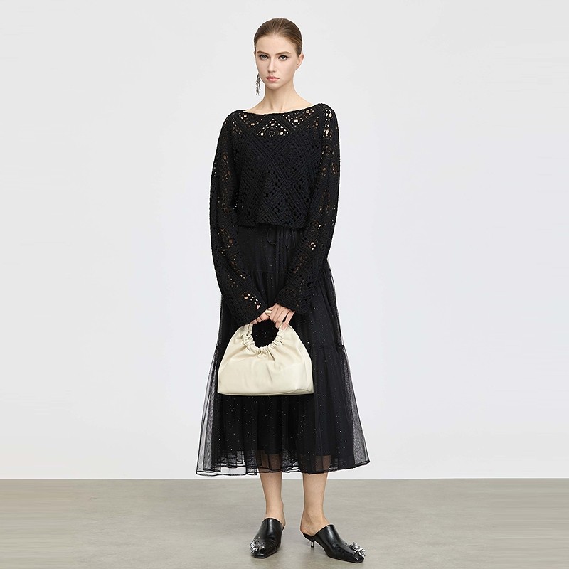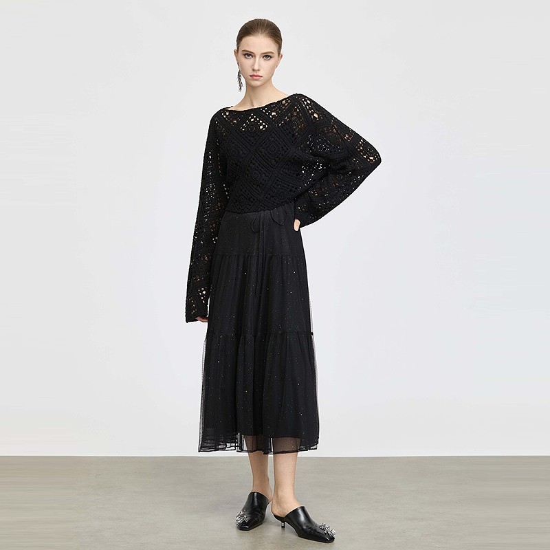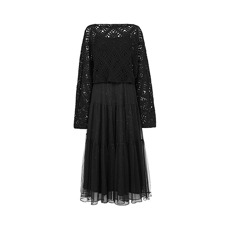 sdeer圣迪奥女装25年秋装镂空收腰网纱针织衫连衣裙套装S25361402