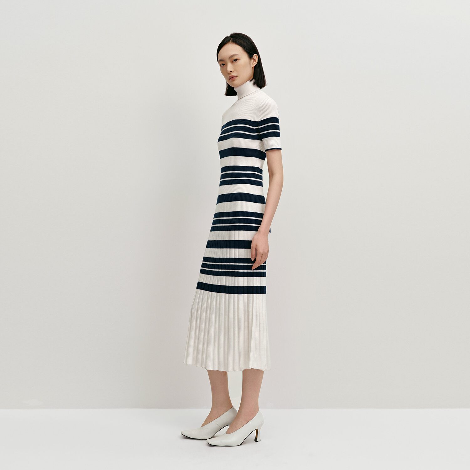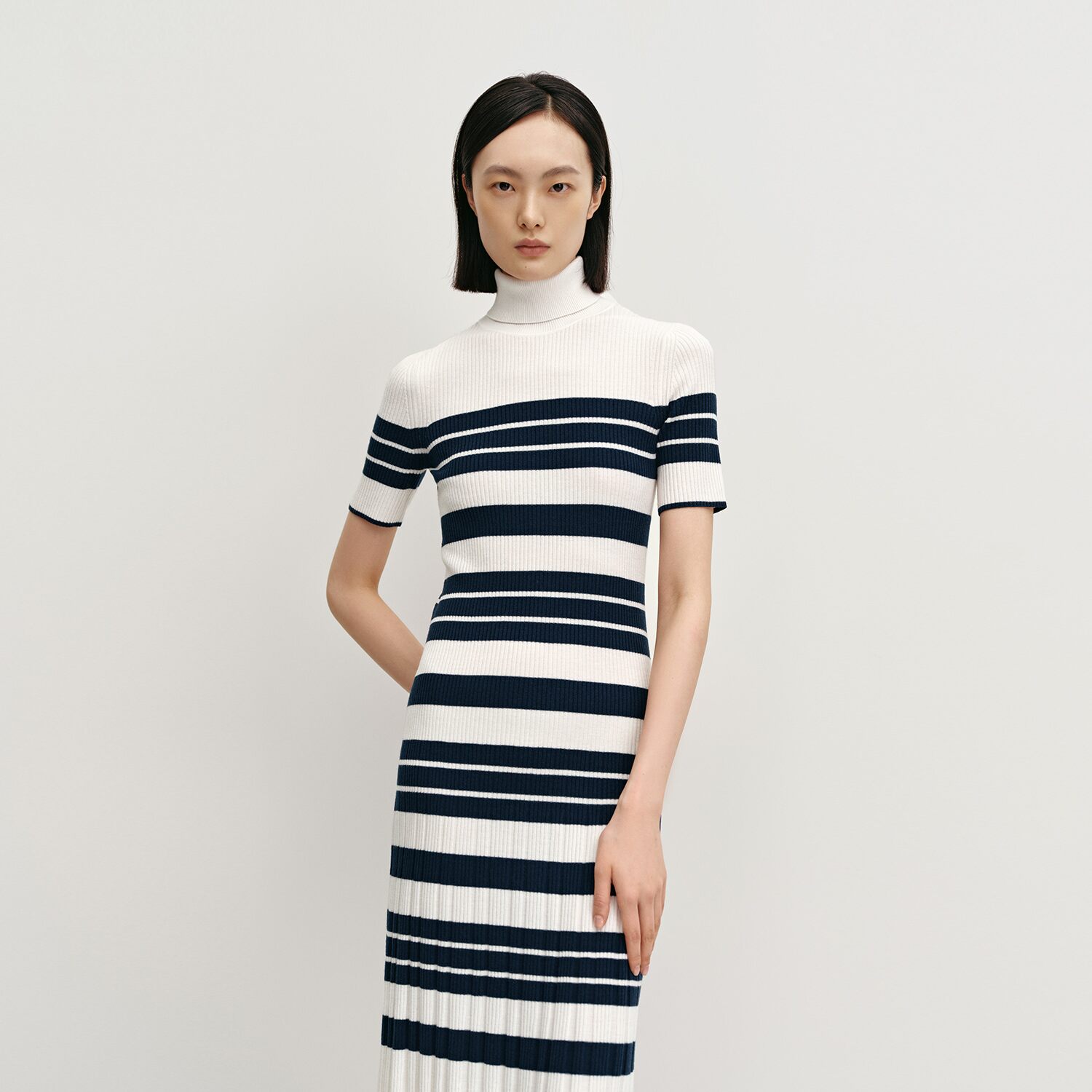 OVVOutlet秋冬热卖女装经典横条纹高领长袖羊毛针织连衣裙