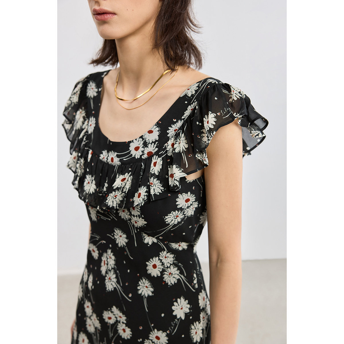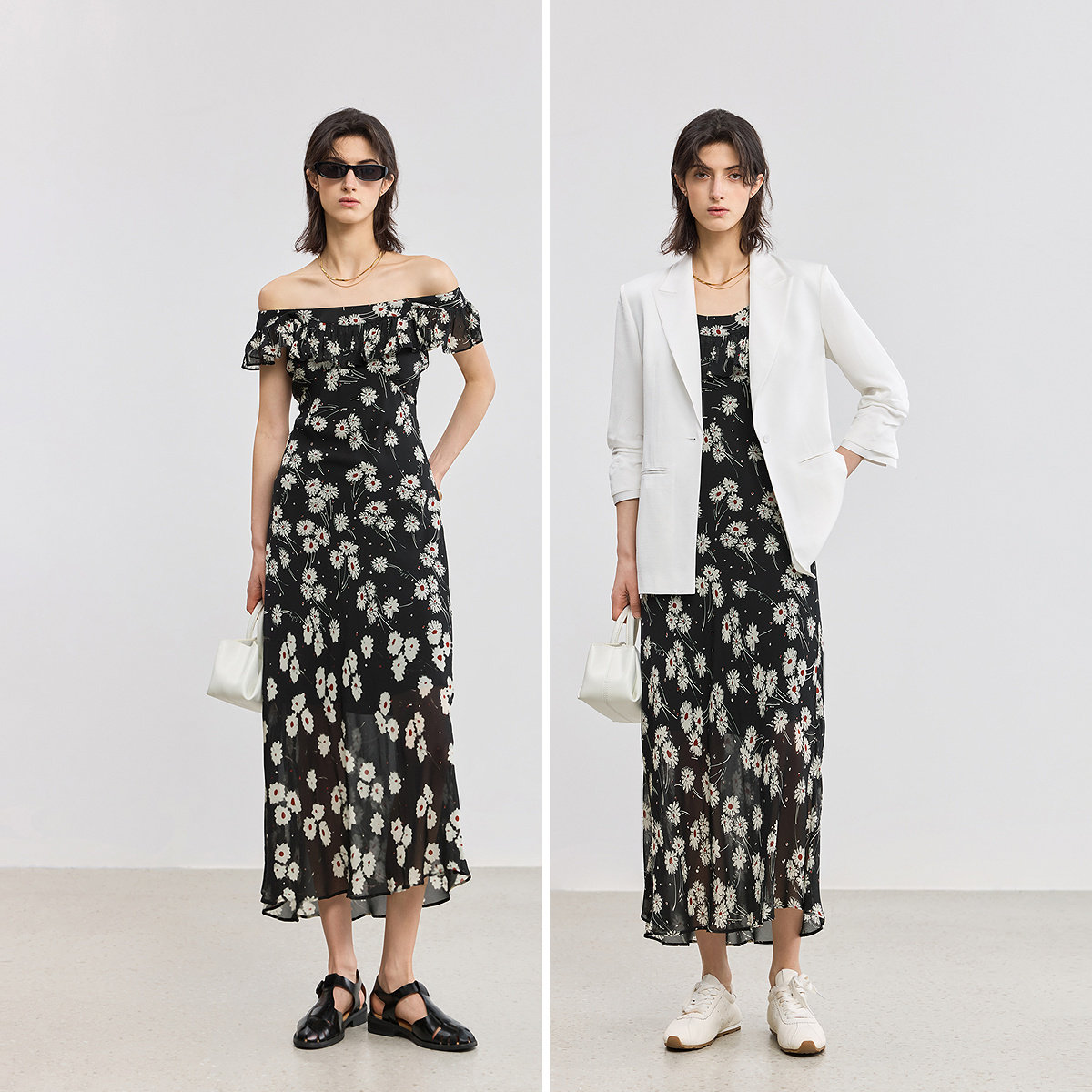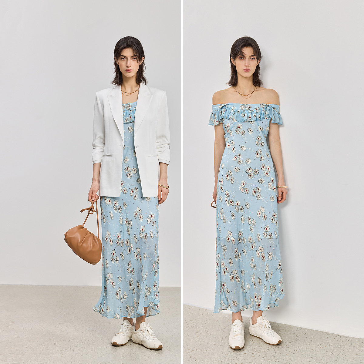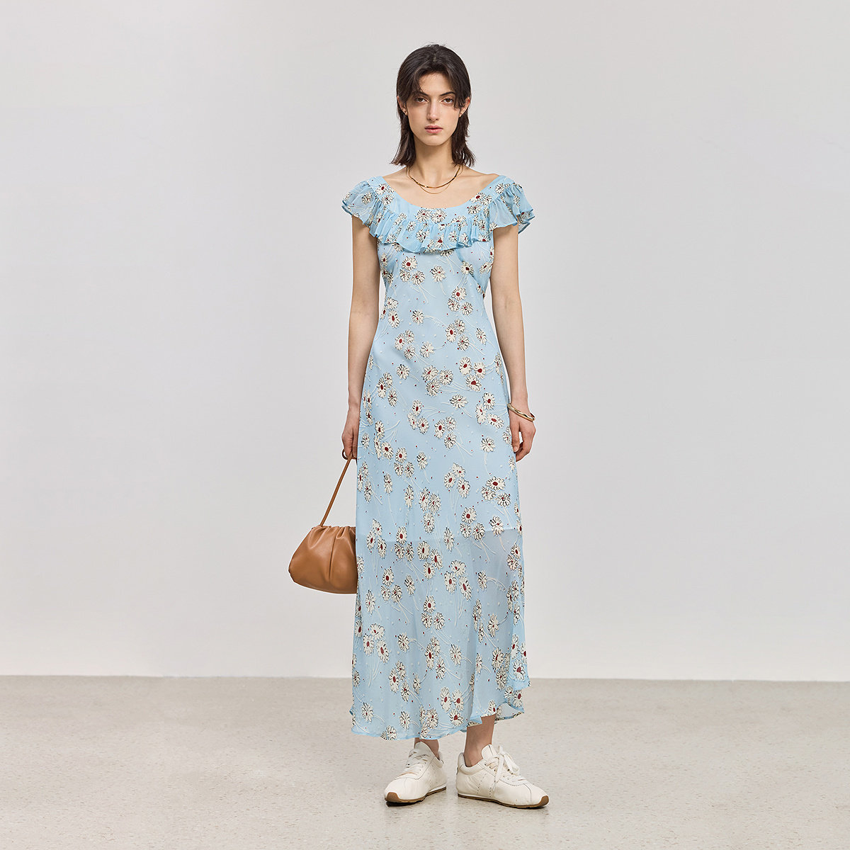 【商场同款】LILY2025新款法式碎花荷叶边斜裁收腰连衣裙长裙女