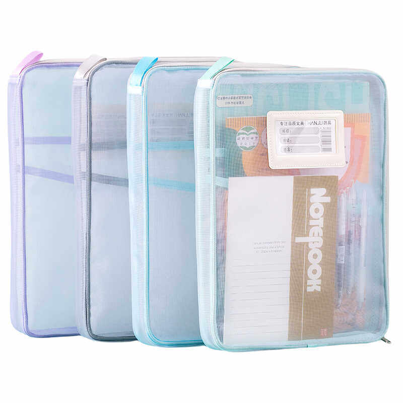 L型学科目分类袋透明网纱文件袋拉链大开口学生手提拎书袋考试用