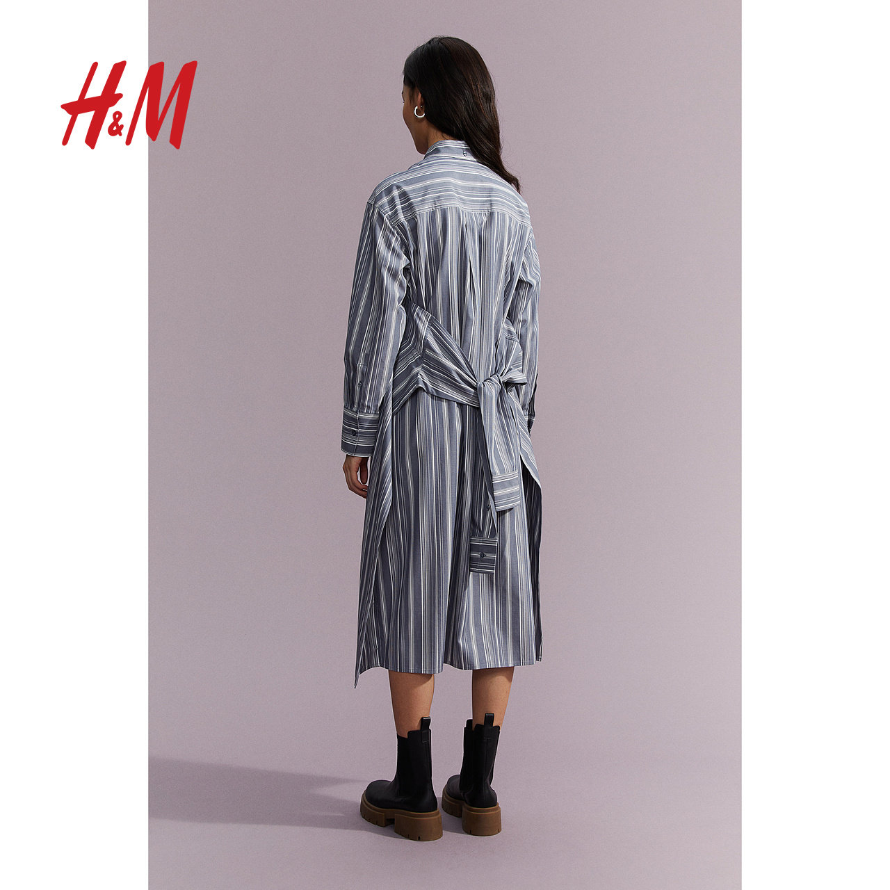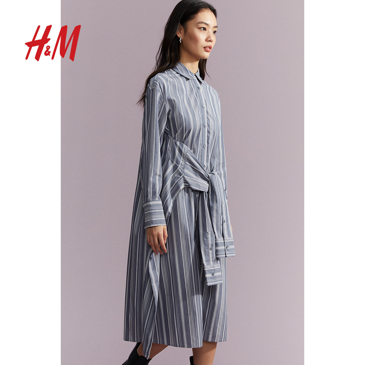 HM女装连衣裙冬季休闲时尚条纹衬衫式中长裙腰带衬衫裙1211490