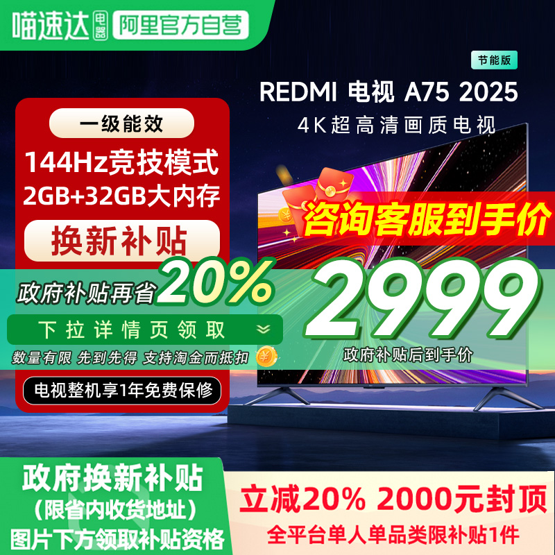 【政府补贴20%】小米REDMI A75英寸节能版144Hz高刷平板电视2025