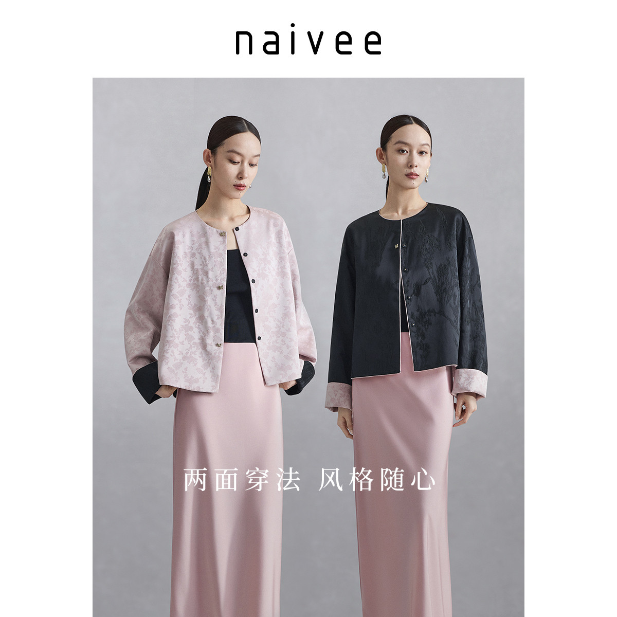 明星同款纳薇2025秋上衣无领缎面提花外套女秋新中式轻国风衣服