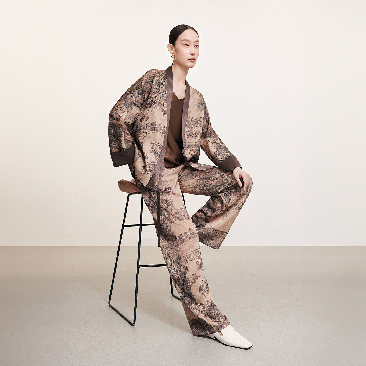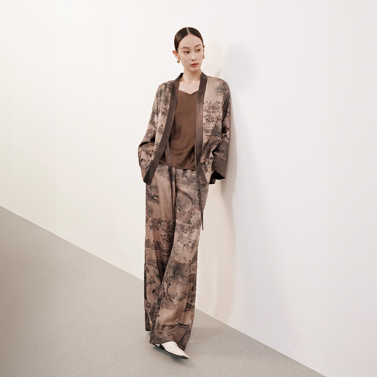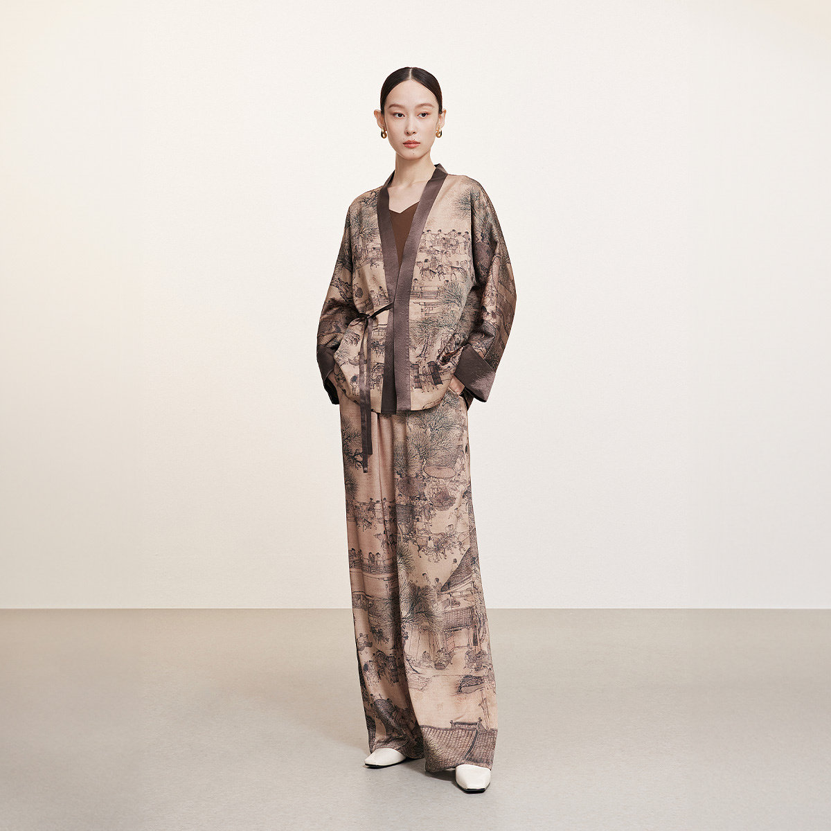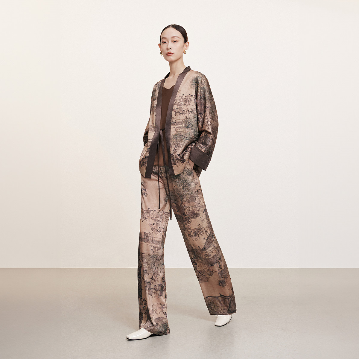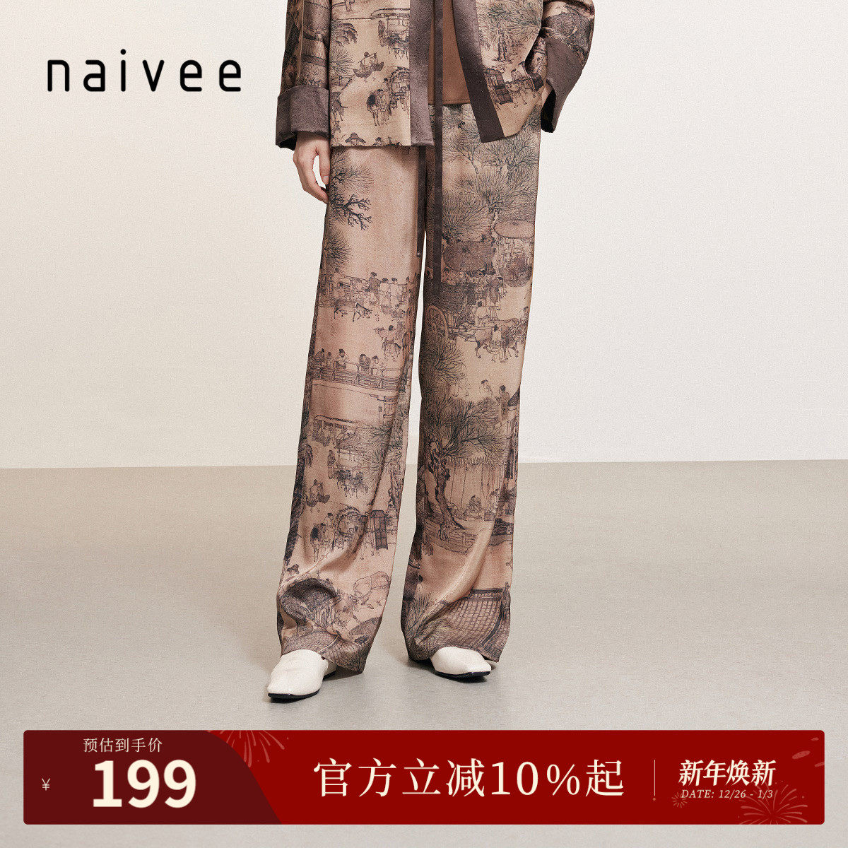 商场同款naivee纳薇秋新中式经典款清明上河图印花直筒休闲裤女