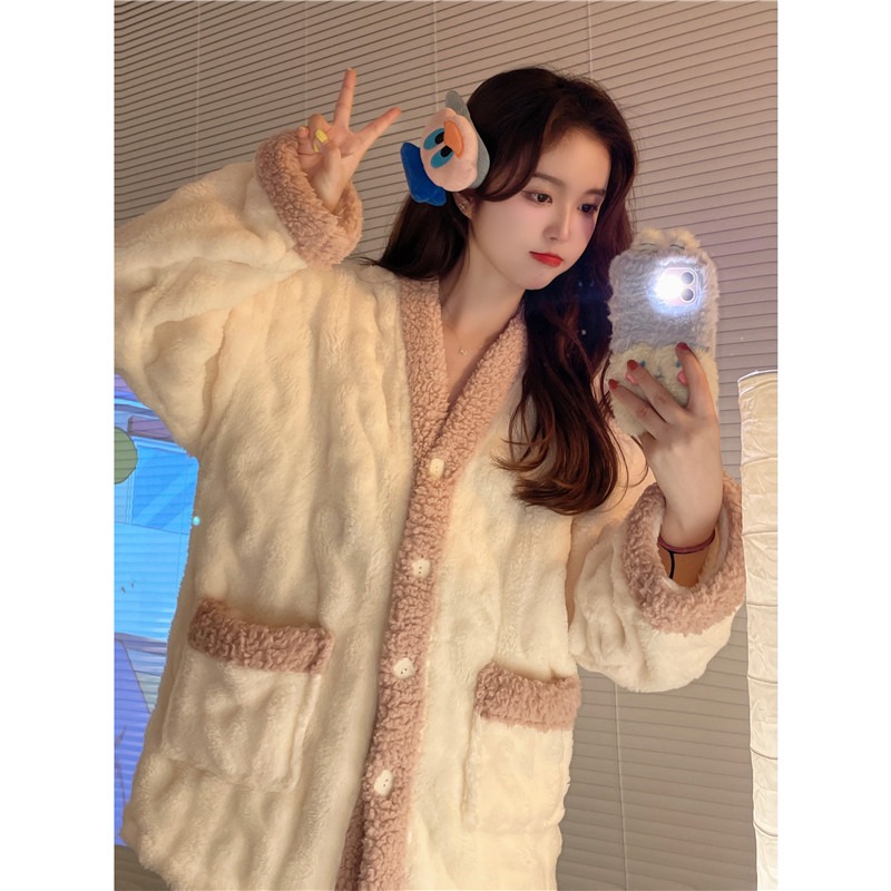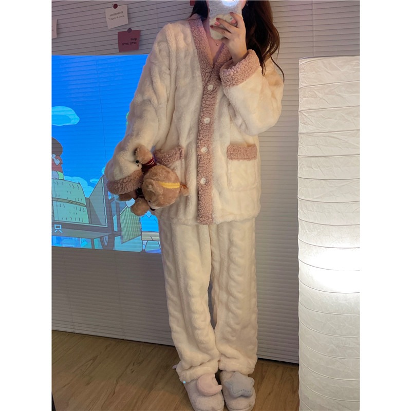 少女甜美小香风珊瑚绒睡衣女加绒加厚冬季法兰绒大码家居服套装冬