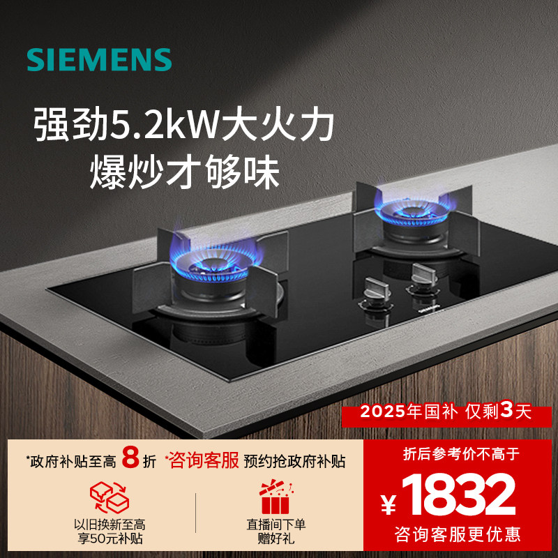 【新品】西门子嵌入式燃气灶具5.2大火力厨房家用双灶天然气3VBMP