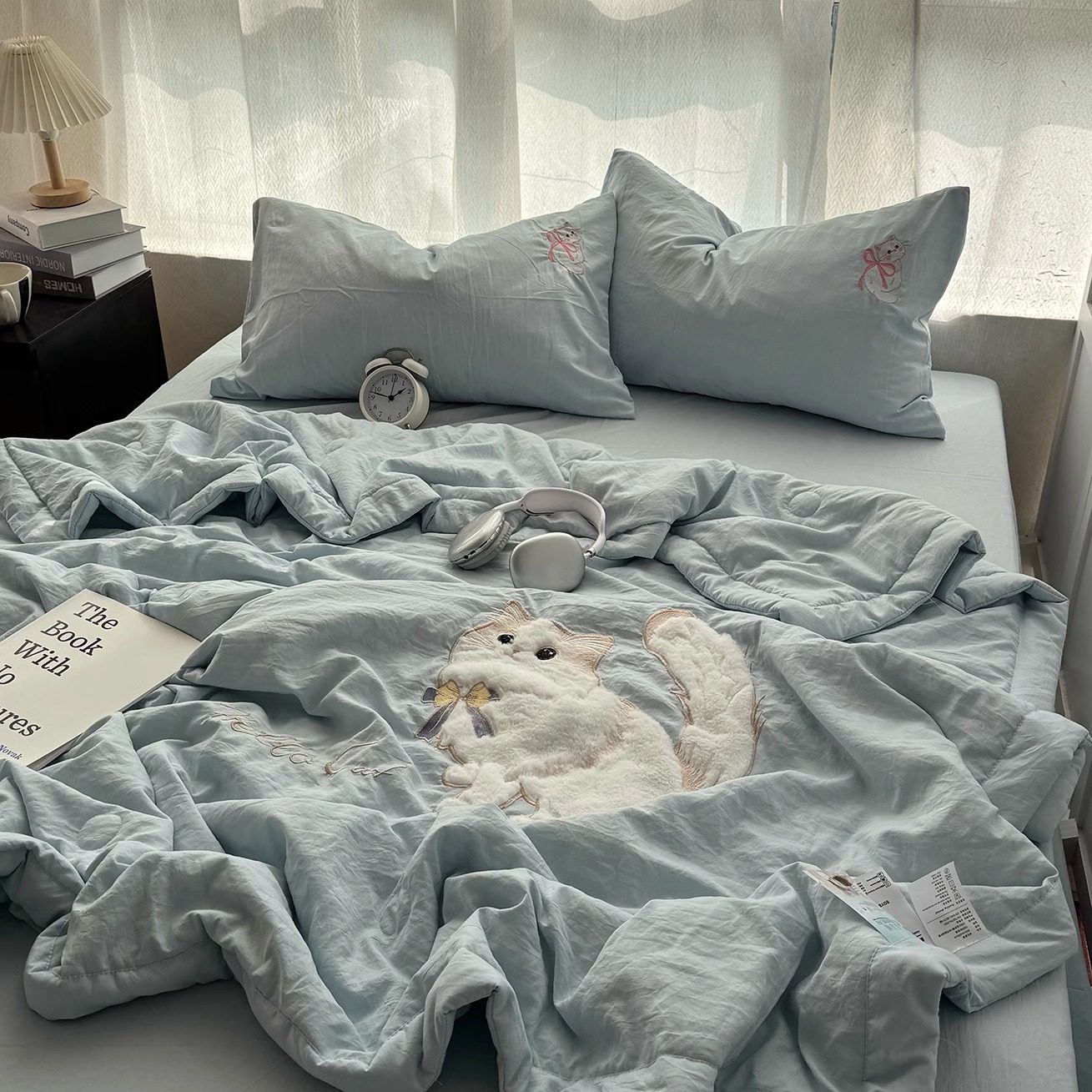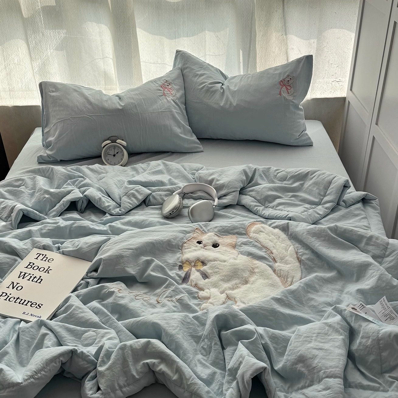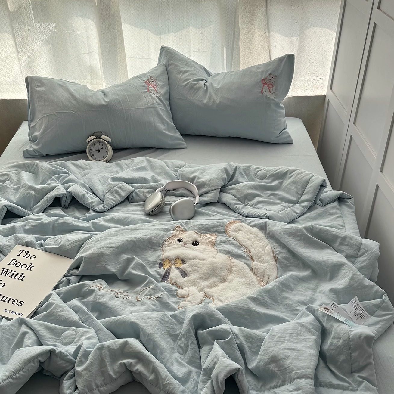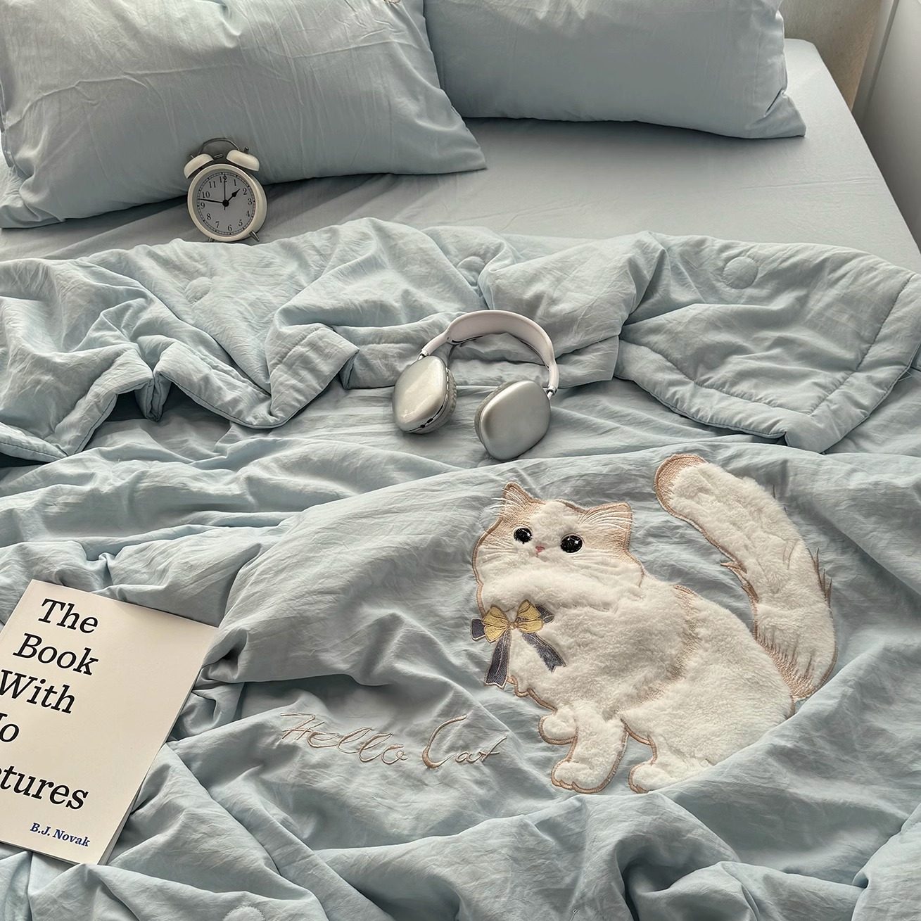 少女ins清新小奶猫立体贴布绣夏被四件套可机洗夏季空调被三件套