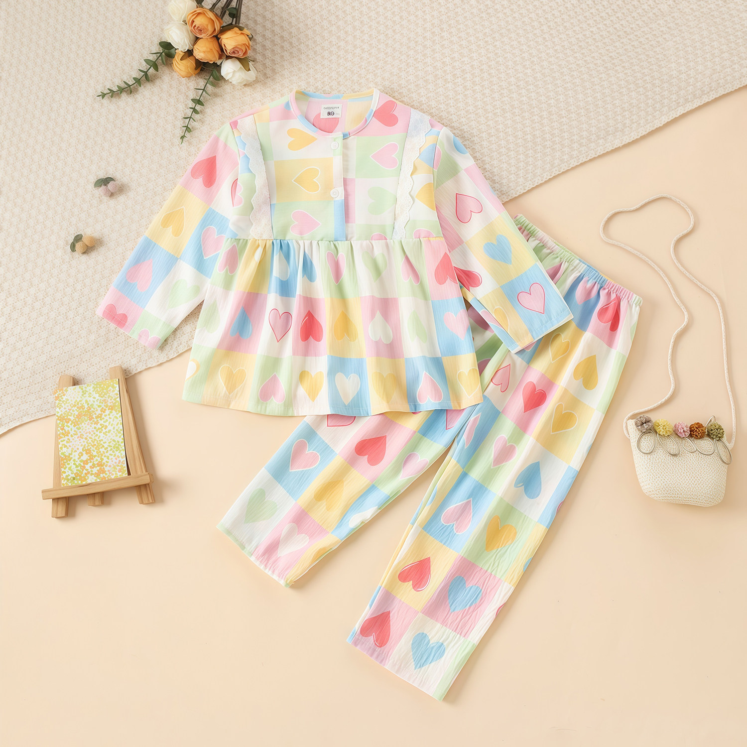 爱慕儿童套头长袖家居服套装/马甲男女童印花T恤裤子宽松睡衣新款