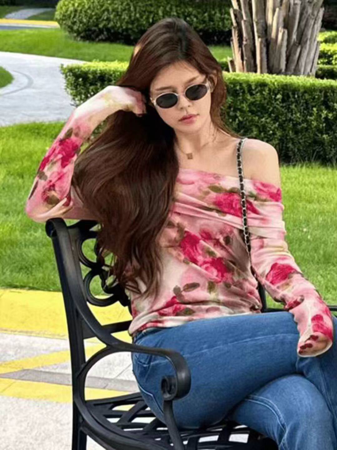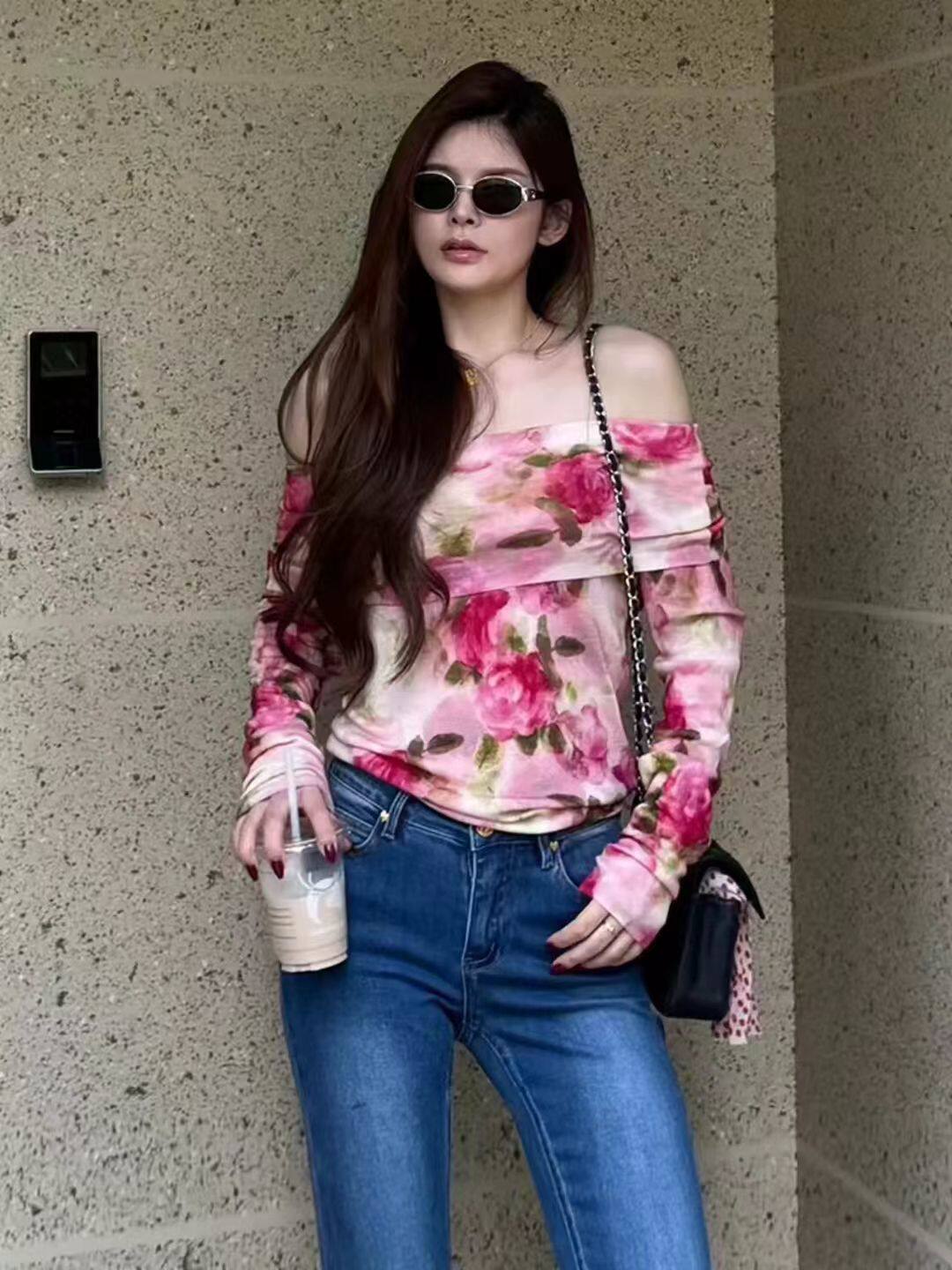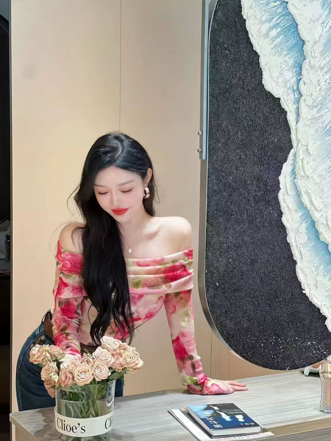2025秋冬新款时尚气质优雅百搭显瘦一字领长袖印花羊绒毛衣女上衣