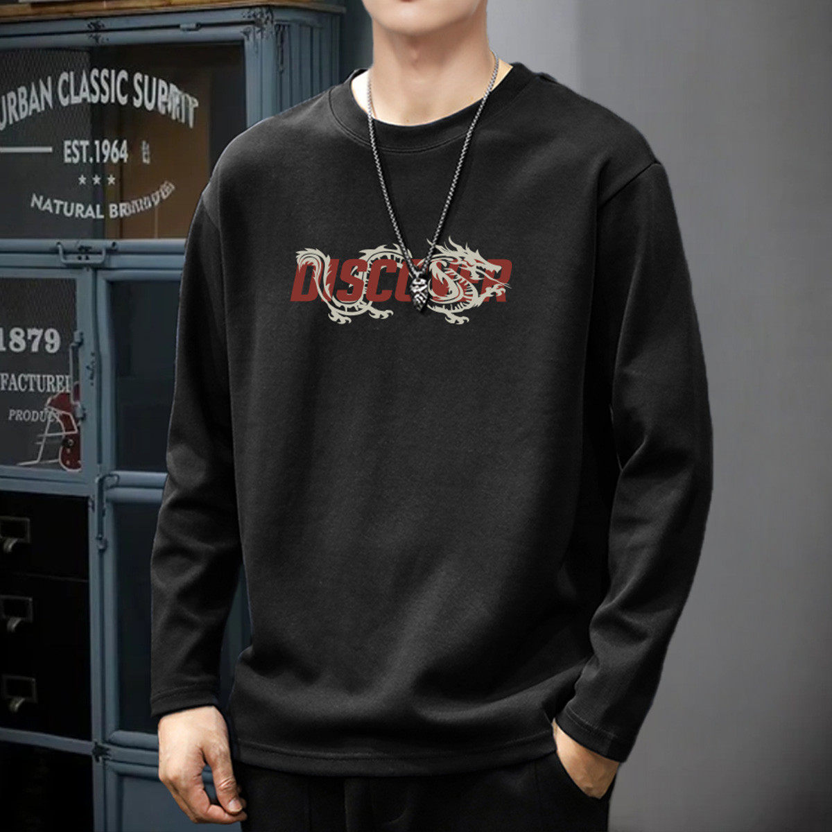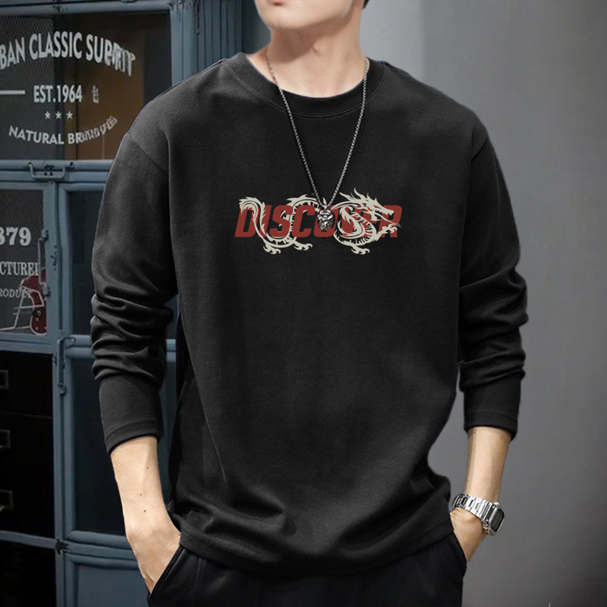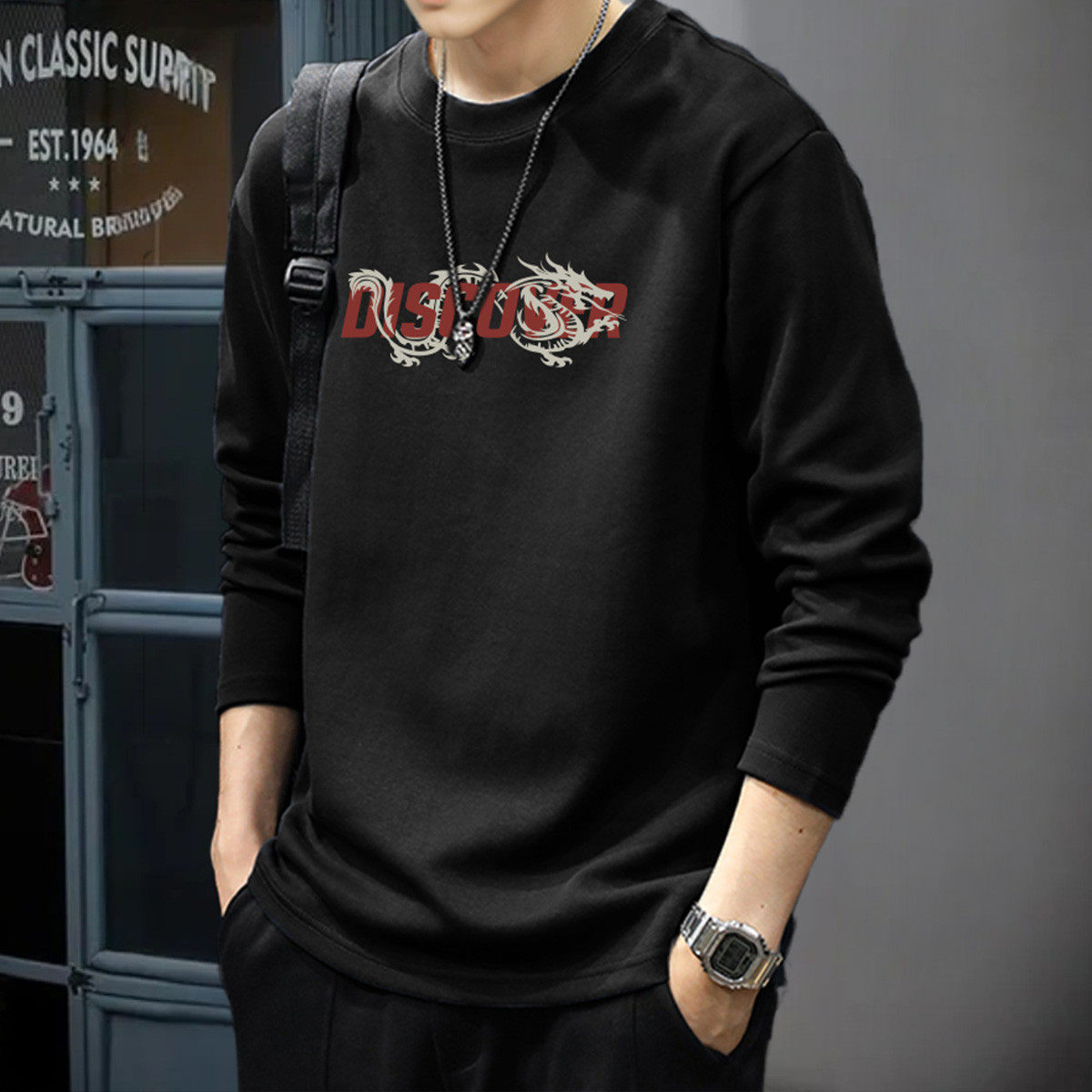 唐狮春秋男长袖t恤潮牌印花T恤纯棉港风帅气上衣运动风男士深灰TE