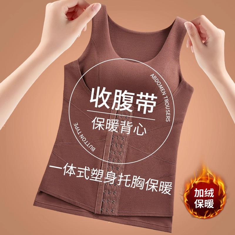 加绒加厚保暖背心收腹内衣带文胸一体塑身衣红色德绒内搭美体发热