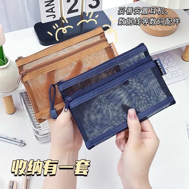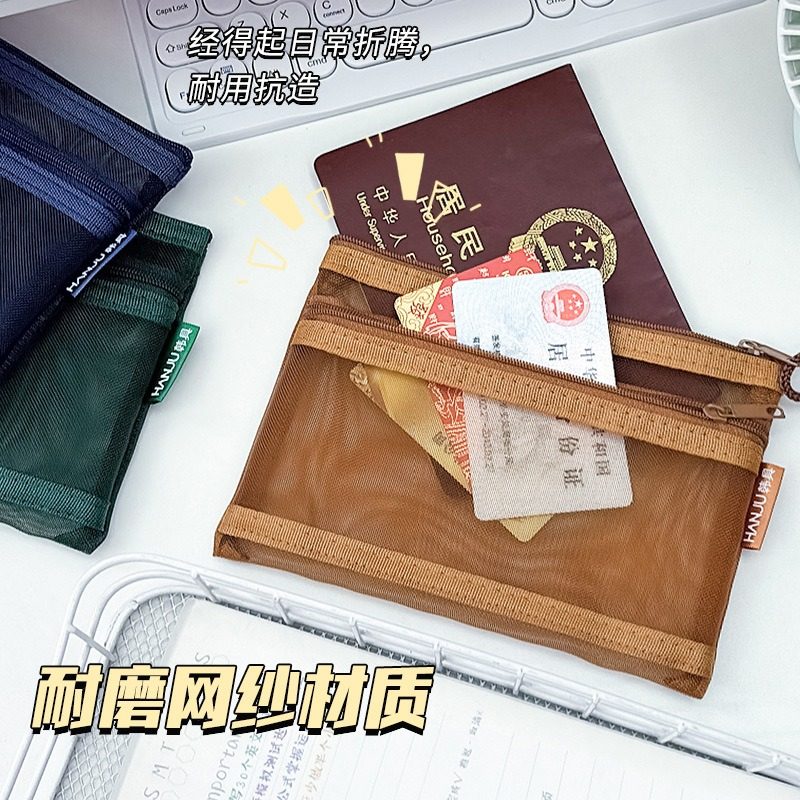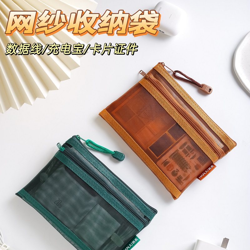 2025新款复古收纳包大容量双层透明网纱数据线耳机充电宝身份证零钱包户口本证件票据收纳袋钥匙卡包化妆包