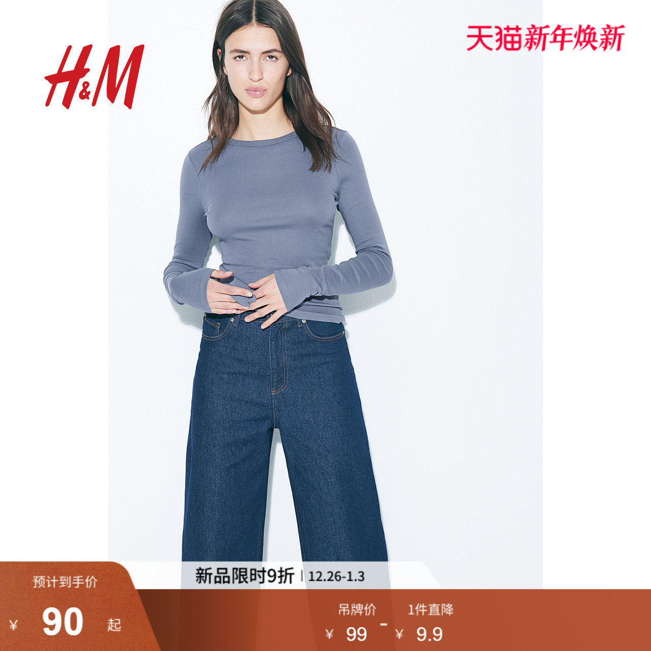 HM女装T恤2025冬季新款简约长袖圆领棉质修身时尚休闲上衣1254718