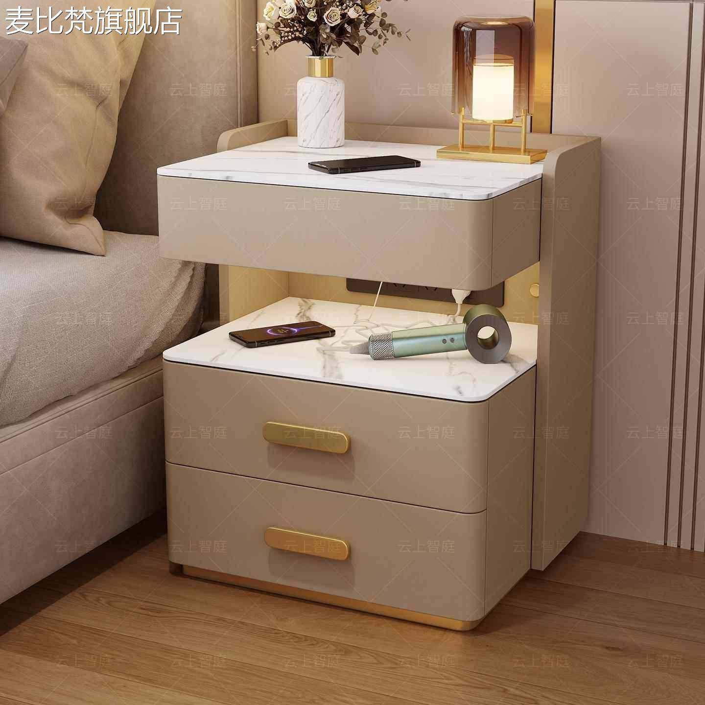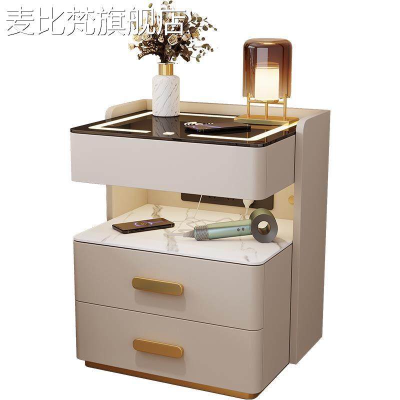 麦比梵奶油风轻奢实木智能床头 柜 简约现代多功能家用卧室岩板充电床边 柜摆件饰品床笠拉车
