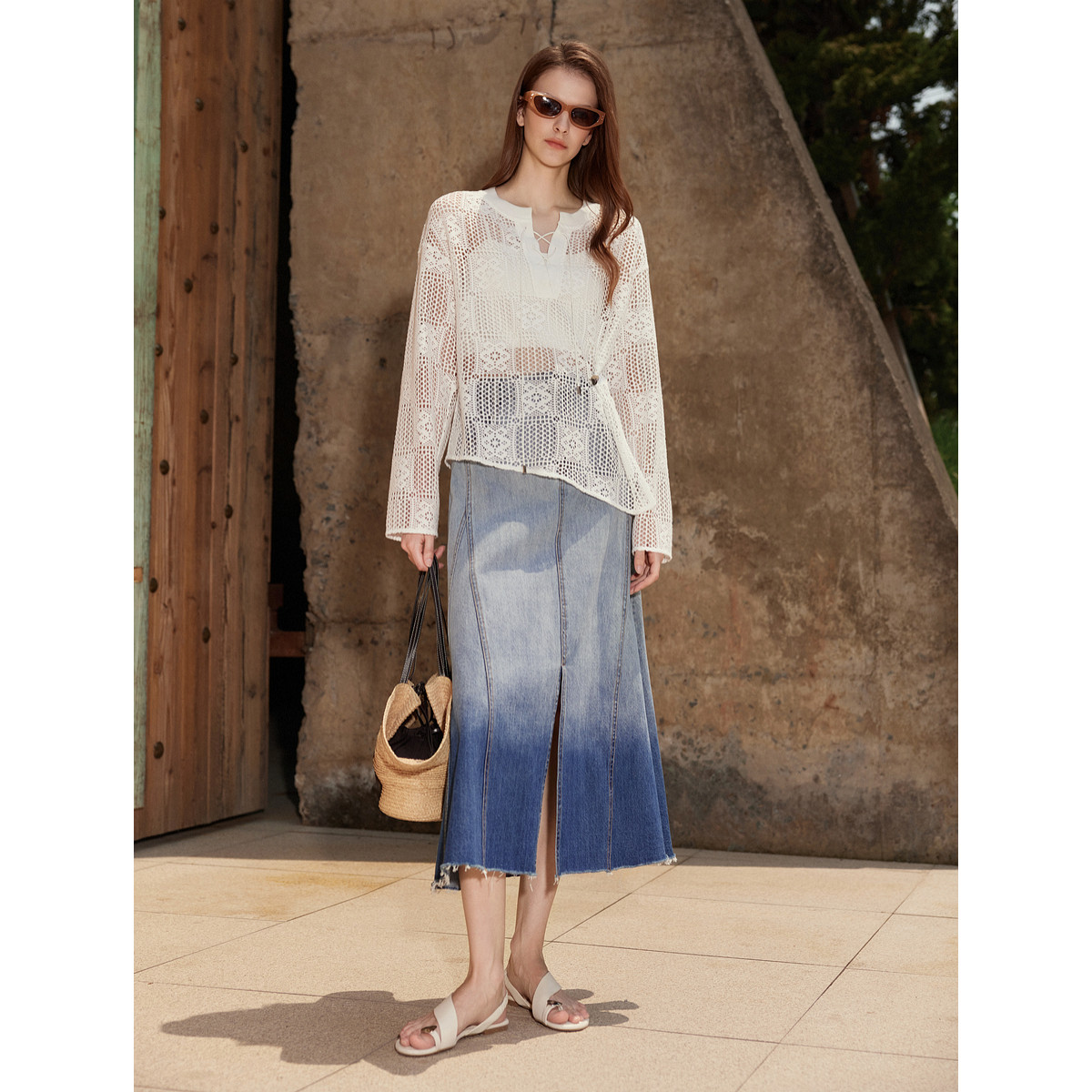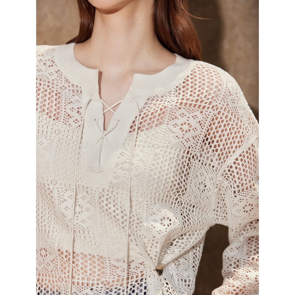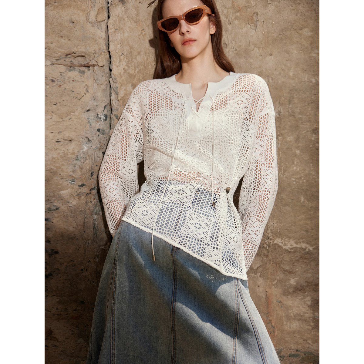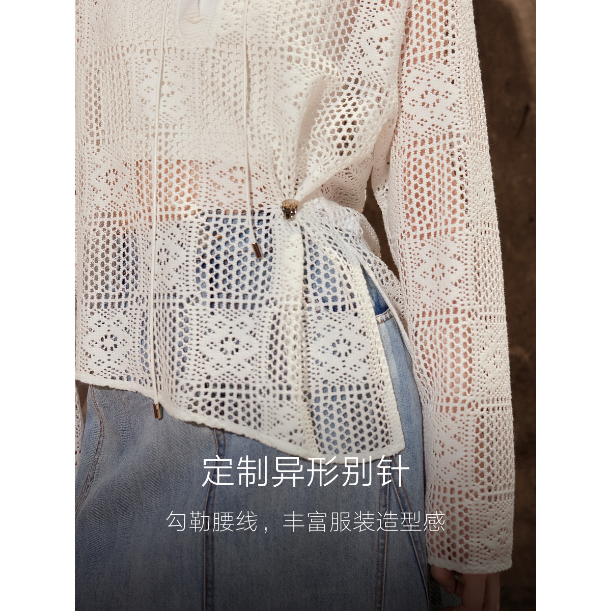 ELLE白色镂空绣花衬衫女2025夏季度假文艺风高级感时髦罩衫上衣