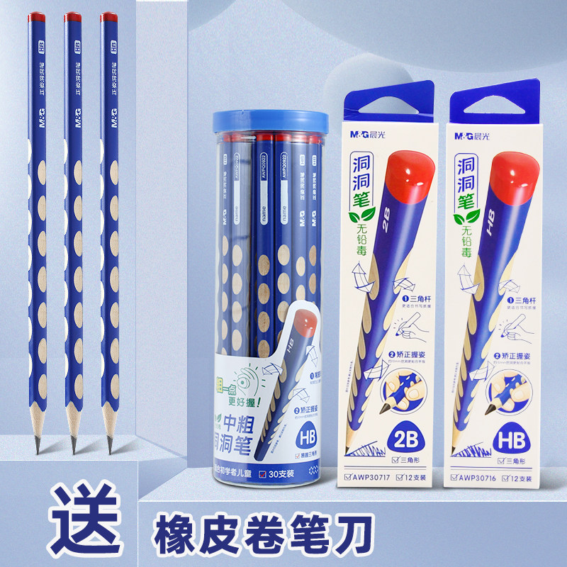晨光官方正姿粗杆洞洞铅笔HB三角杆素描笔幼儿园儿童小学生一年级专用2B加粗铅笔练字安全无毒三角粗杆洞洞笔