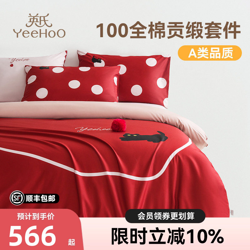 英氏儿童四件套a类纯棉贡缎床上床单床品套件春秋季被套喵喵咪呀