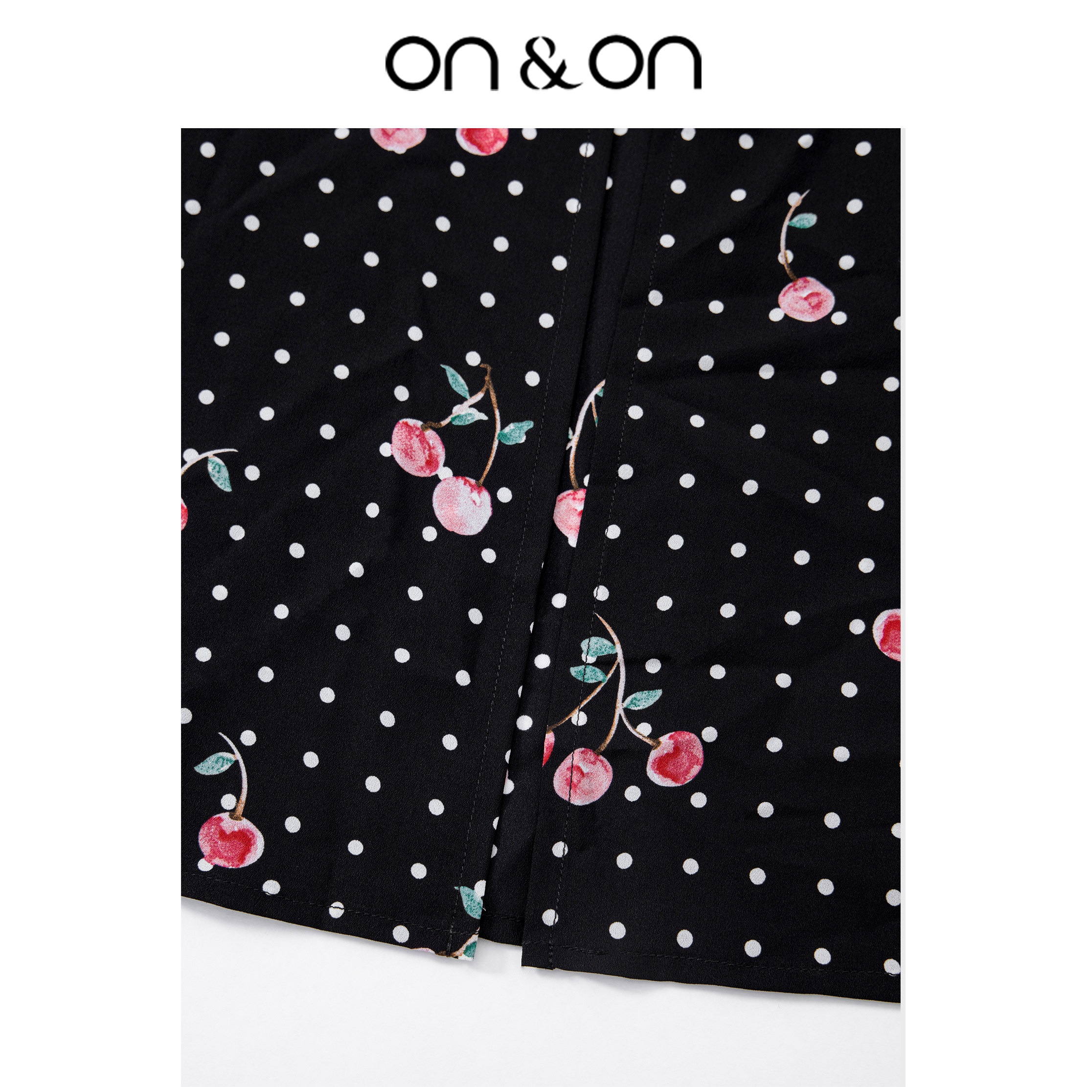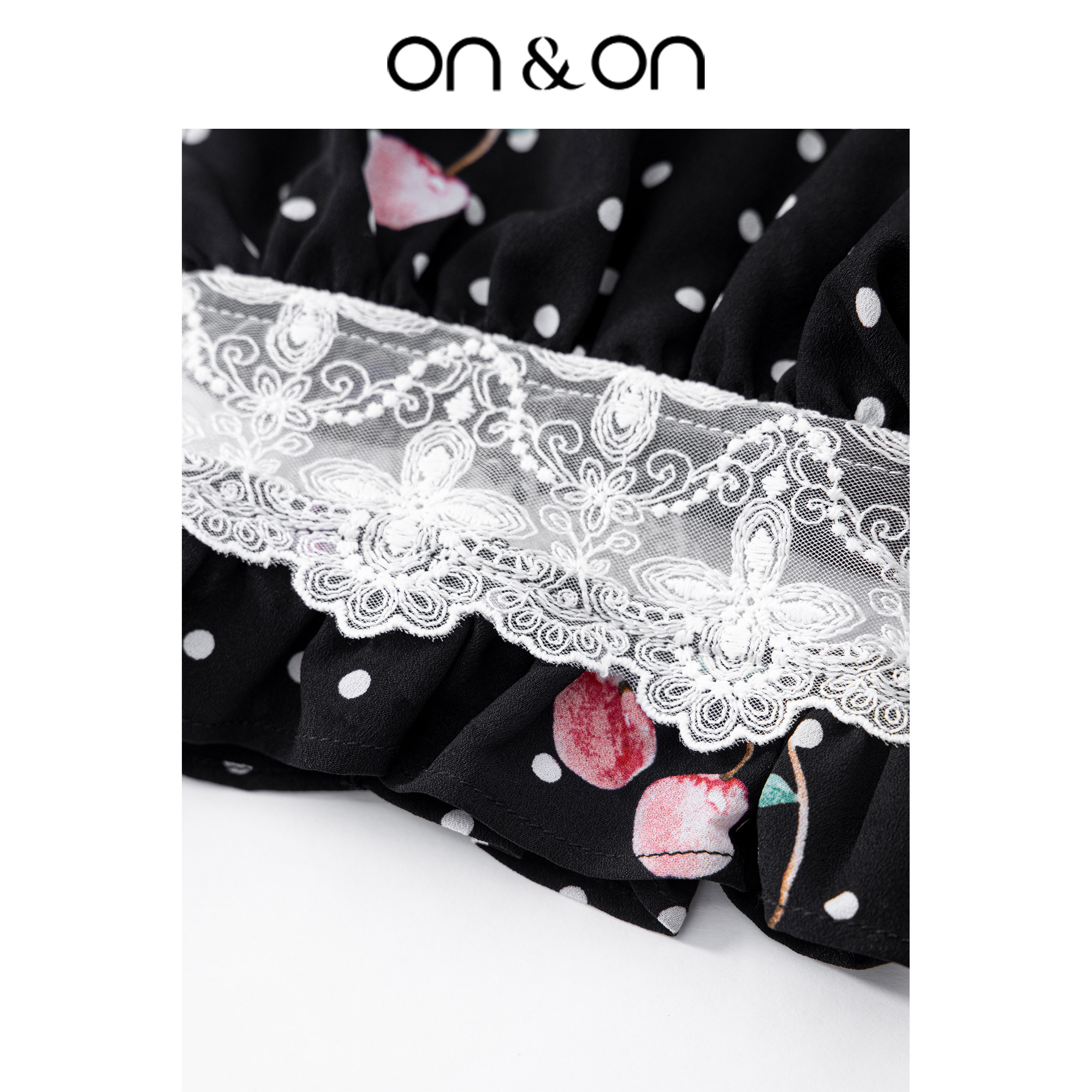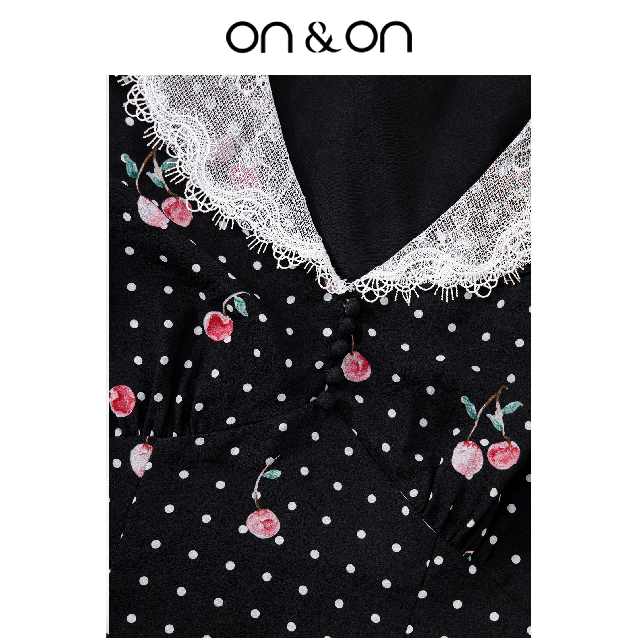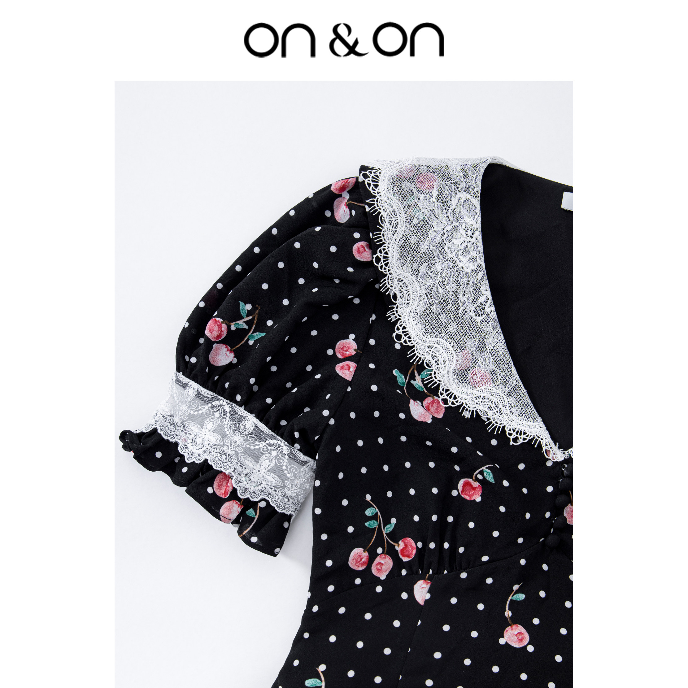 ON&ON/安乃安V领蕾丝泡泡袖A字碎花女连衣裙樱桃收腰气质连衣裙