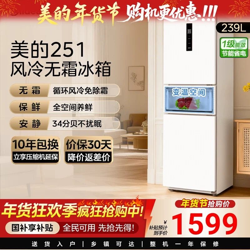 美的251三开门风冷无霜家用小户型出租房宿舍用超薄一级低噪冰箱