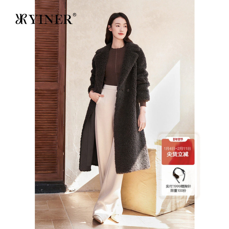 YINER音儿专选冬季长款西装领环保羊毛皮草大衣外套
