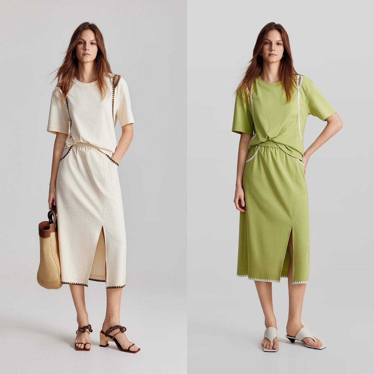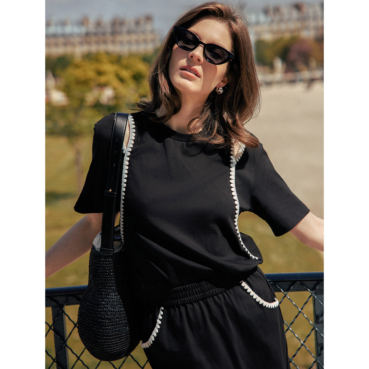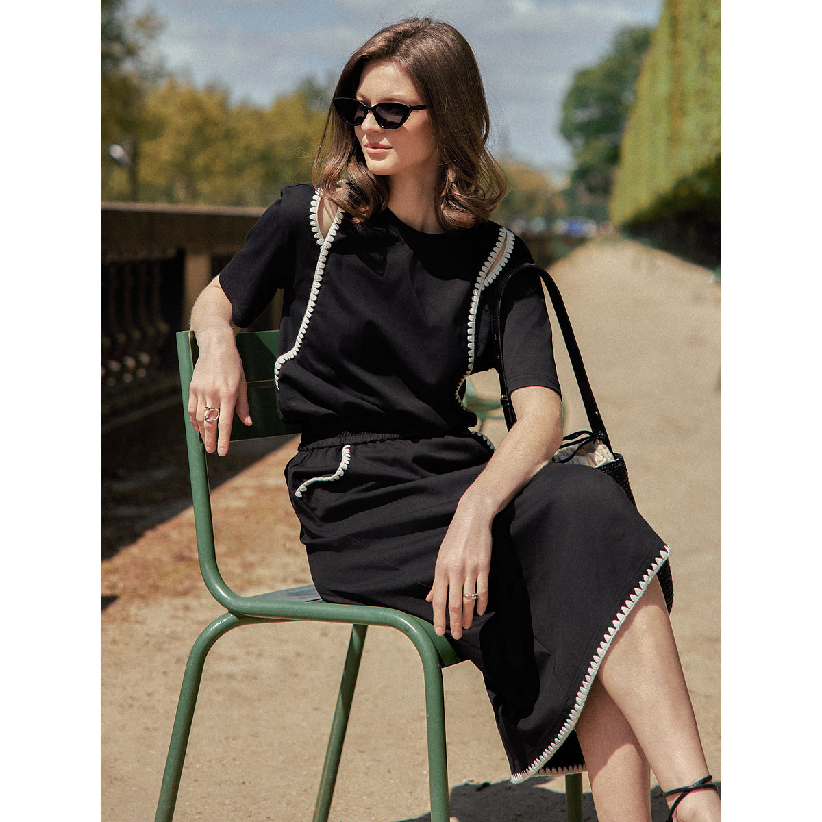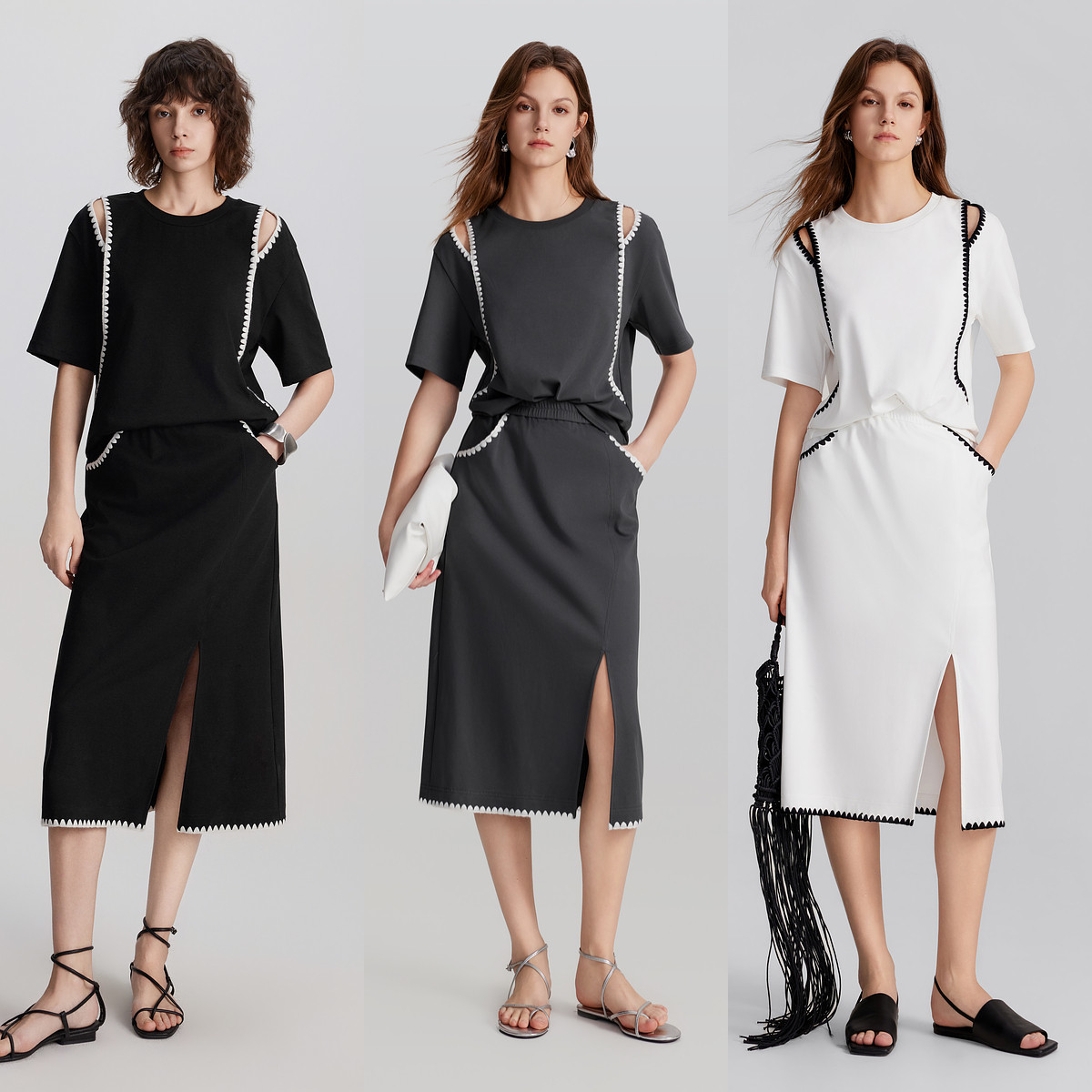 ELLE黑色设计感露肩圆领短袖T恤女2025夏新款高腰开叉半身裙套装