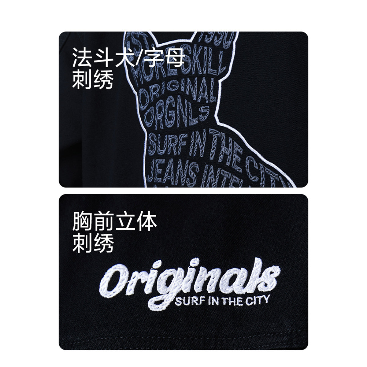 胸前撞色立体字母刺绣,背后法斗字母刺绣