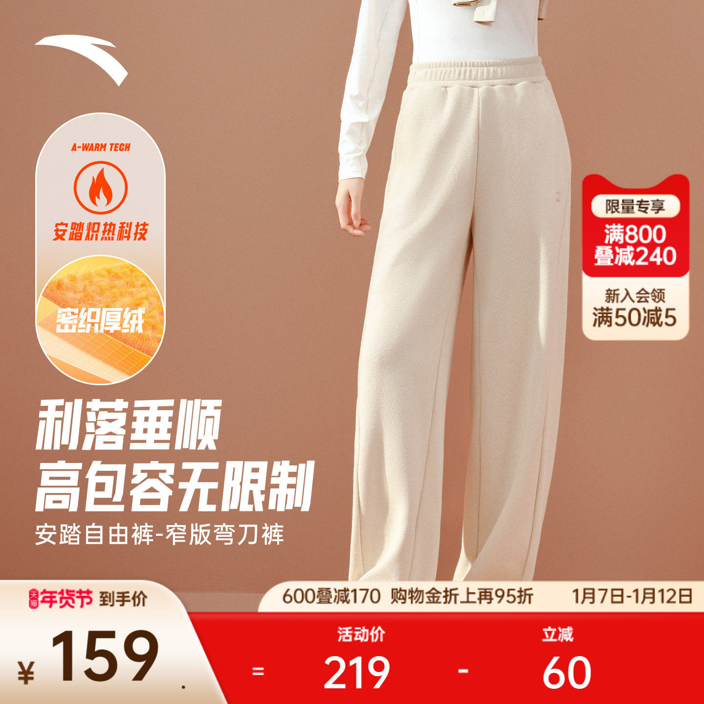 安踏自由裤丨窄版弯刀裤加绒香蕉裤女士冬季直筒阔腿裤运动裤卫裤