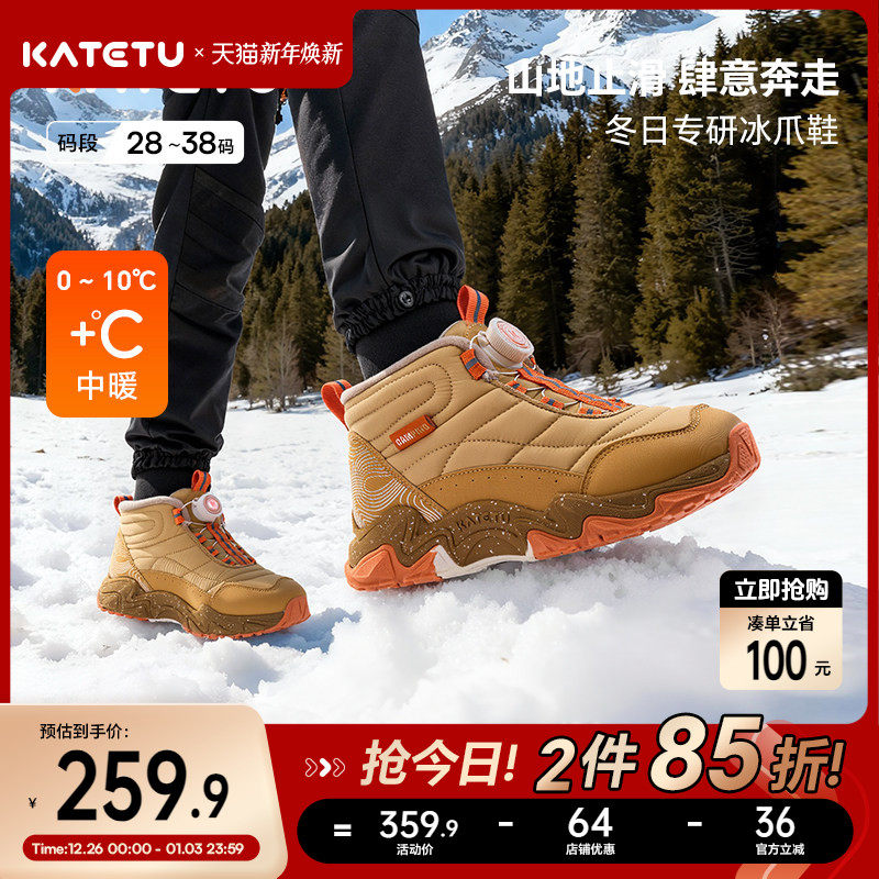 卡特兔户外儿童运动鞋2025冬季旋钮扣冰爪防滑加绒保暖儿童棉鞋